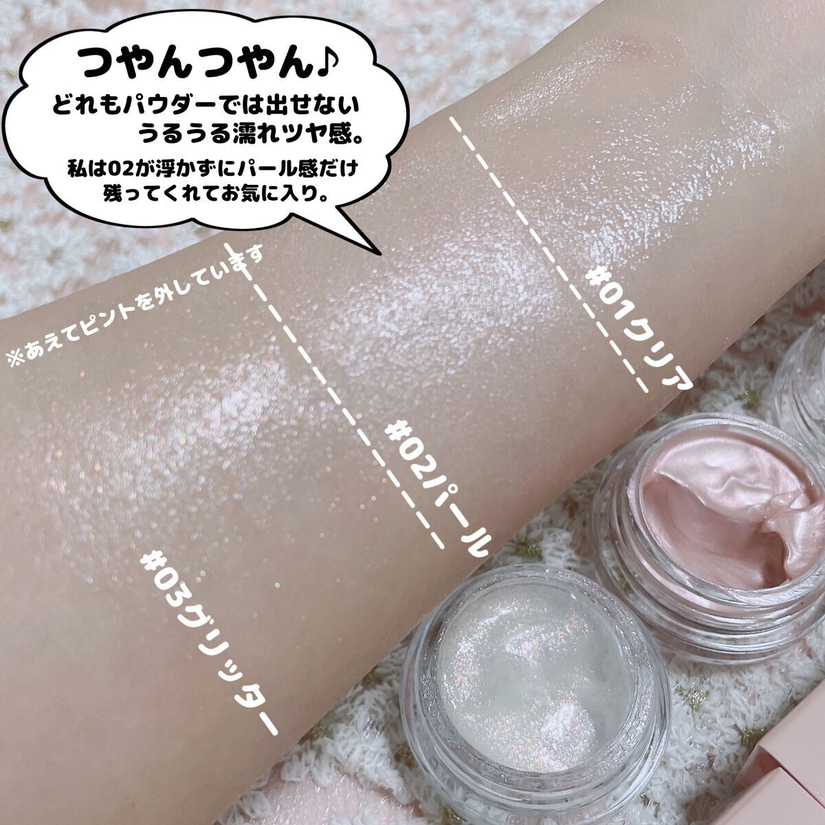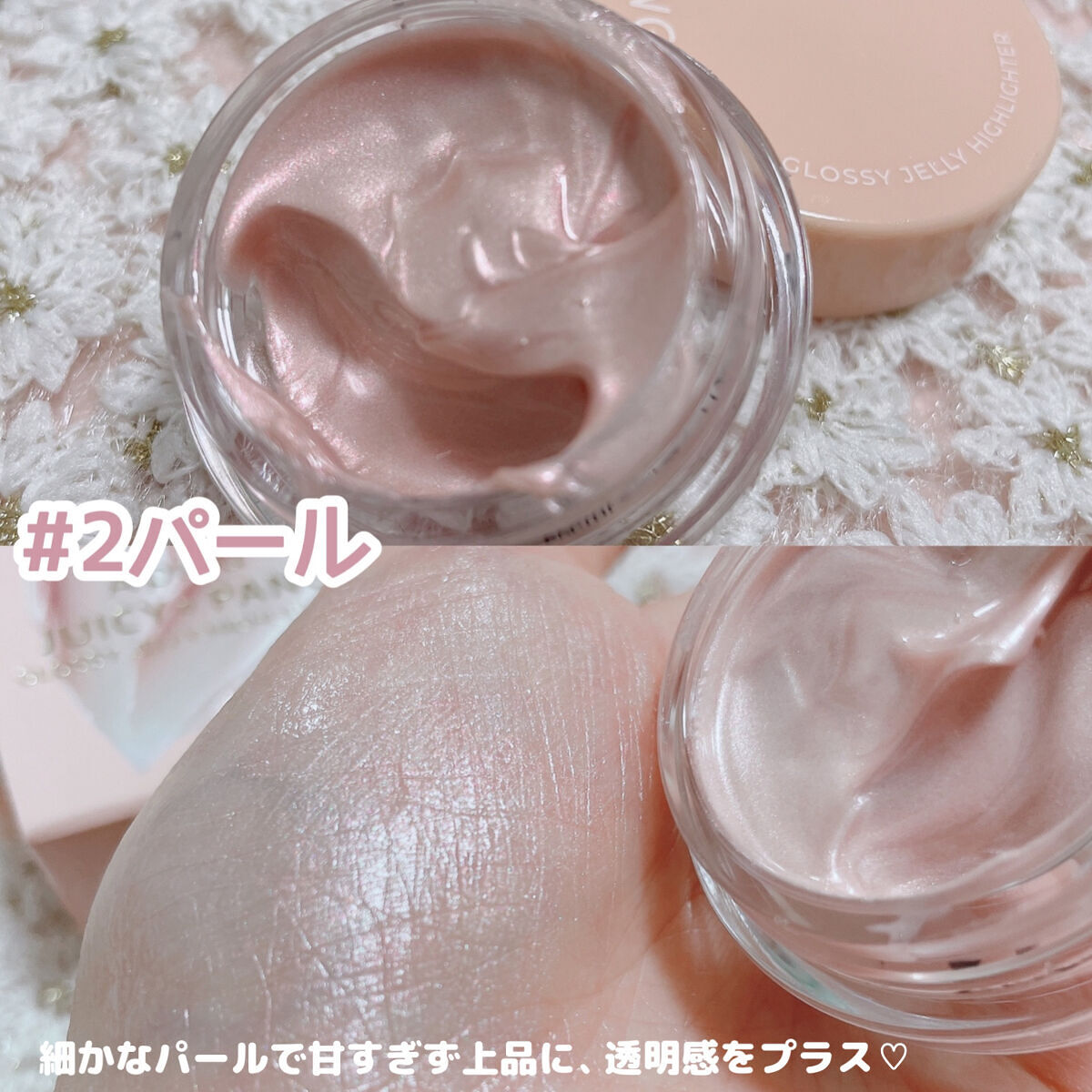 - <2 ピンクシェル(Pink Shell)> 水添ポリ(C6-14オレフィン)、トリイソステアリン酸ポリグリセリル-2、水添(スチレン/イソプレン)コポリマー、炭酸ジカプリリル、マイカ、酸化チタン、合成フルオロフロゴパイト、1,2-ヘキサンジオール、酸化鉄、安息香酸ベンジル、酸化スズ、水、シリカ、アルガニアスピノサ核油、BG、トコフェロール、リナロール、リモネン、モモ果実エキス、ヒアルロン酸Na、加水分解コラーゲン、ヒアルロン酸ヒドロキシプロピルトリモニウム、エチルヘキシルグリセリン、加水分解ヒアルロン酸、アセチルヒアルロン酸Na、ヒアルロン酸、加水分解ヒアルロン酸Na、ヒアルロン酸クロスポリマーNa、ヒアルロン酸K、フェノキシエタノール、香料 <4 ムーンライト(Moonlight)> 水添ポリ(C6-14オレフィン)、トリイソステアリン酸ポリグリセリル-2、水添(スチレン/イソプレン)コポリマー、炭酸ジカプリリル、マイカ、酸化チタン、1,2-ヘキサンジオール、水、酸化鉄、酸化スズ、テトラ(ジ-t-ブチルヒドロキシヒドロケイヒ酸)ペンタエリスリチル、アルガニアスピノサ核油、トコフェロール、BG、モモ果実エキス、ヒアルロン酸Na、加水分解コラーゲン、ヒアルロン酸ヒドロキシプロピルトリモニウム、エチルヘキシルグリセリン、アセチルヒアルロン酸Na、加水分解ヒアルロン酸、ヒアルロン酸、ヒアルロン酸クロスポリマーNa、加水分解ヒアルロン酸Na、ヒアルロン酸K、フェノキシエタノール、香料 <5 マーメイド(Mermaid)> 水添ポリ(C6-14オレフィン)、トリイソステアリン酸ポリグリセリル-2、水添(スチレン/イソプレン)コポリマー、炭酸ジカプリリル、マイカ、酸化チタン、合成フルオロフロゴパイト、1,2-ヘキサンジオール、酸化スズ、水、コンジョウ、テトラ(ジ-t-ブチルヒドロキシヒドロケイヒ酸)ペンタエリスリチル、アルガニアスピノサ核油、トコフェロール、BG、モモ果実エキス、ヒアルロン酸Na、加水分解コラーゲン、ヒアルロン酸ヒドロキシプロピルトリモニウム、エチルヘキシルグリセリン、アセチルヒアルロン酸Na、加水分解ヒアルロン酸、ヒアルロン酸、ヒアルロン酸クロスポリマーNa、加水分解ヒアルロン酸Na、ヒアルロン酸K、フェノキシエタノール、香料 <6 シークレットジェム(Secret Gem)> 水添ポリ(C6-14オレフィン)、トリイソステアリン酸ポリグリセリル-2、水添(スチレン/イソプレン)コポリマー、炭酸ジカプリリル、酸化チタン、マイカ、合成フルオロフロゴパイト、1,2-ヘキサンジオール、水、酸化スズ、テトラ(ジ-t-ブチルヒドロキシヒドロケイヒ酸)ペンタエリスリチル、アルガニアスピノサ核油、トコフェロール、カルミン、コンジョウ、BG、モモ果実エキス、ヒアルロン酸Na、加水分解コラーゲン、ヒアルロン酸ヒドロキシプロピルトリモニウム、エチルヘキシルグリセリン、アセチルヒアルロン酸Na、加水分解ヒアルロン酸、ヒアルロン酸、ヒアルロン酸クロスポリマーNa、加水分解ヒアルロン酸Na、ヒアルロン酸K、フェノキシエタノール、香料