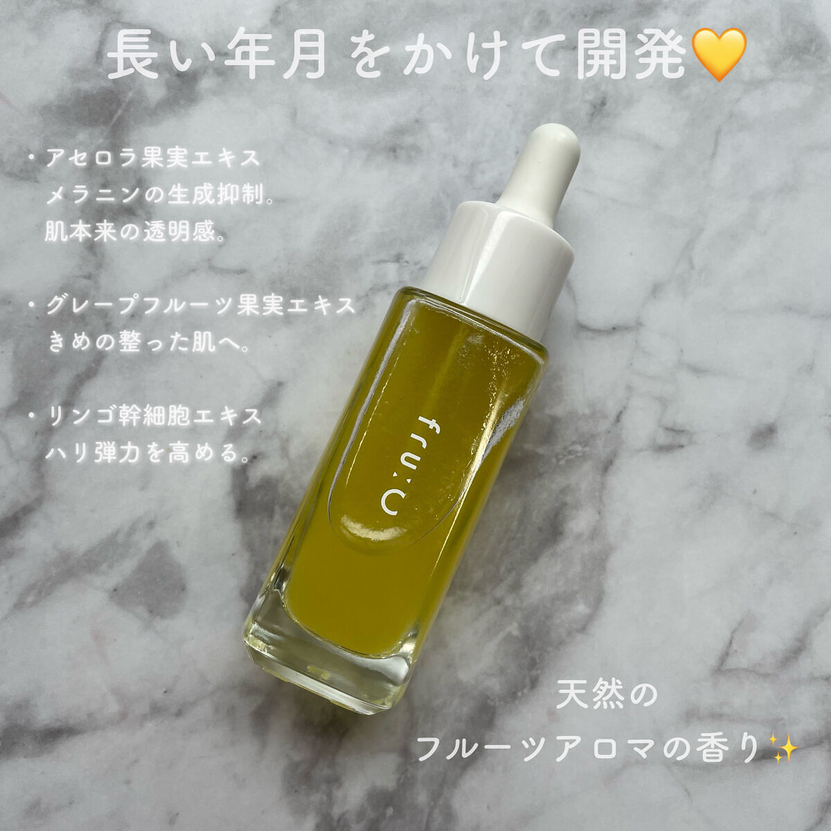 - 美容成分を追求し、たどり着いたフルーツの力とビタミンCの力。 その力を凝縮し誕生した1本4役のビタミンC美容液。 壊れやすいビタミンC*を、独自処方の『ホワイトCカプセル*』でギュッと閉じ込めました。 肌に触れた瞬間カプセルがはじけ新鮮なビタミンC*が肌に広がります。 さらに、厳選のフルーツエキスが肌に潤いを与え透明感あふれる肌に導きます。 1本で「化粧液×美容液×オイル×乳液」の4つの機能。 天然のフルーツアロマの芳醇な香りでスキンケアの時間が癒しの時間に。 *整肌成分