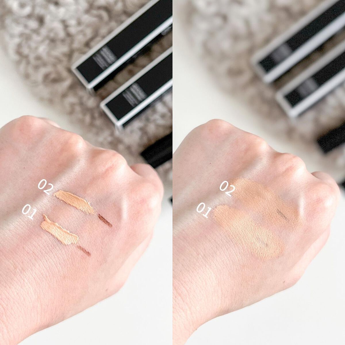 - <01 ライトオークル> 水、シクロペンタシロキサン、セチルPEG/PPG-10/1ジメチコン、グリセリン、BG、トリメチルシロキシケイ酸、ペンチレングリコール、リンゴ酸ジイソステアリル、ジイソステアリン酸ポリグリセリル-2、ジエチルヘキサン酸ネオペンチルグリコール、ジグリセリン、ベタイン、ポリメチルシルセスキオキサン、硫酸Mg、マイカ、ジメチコン、ソルビトール、フェノキシエタノール、ジフェニルシロキシフェニトリメチコン、(ジメチコン/ビニルジメチコン)クロスポリマー、トコフェロール、ヒアルロン酸Na、オリーブ果実油、ホホバ種子油、メドウフォーム油、パルミチン酸レチノール、コーン油、クダモノトケイソウ果実エキス、アロエベラ葉エキス、(+/−)酸化チタン、タルク、酸化鉄、水酸化Al、トリエトキシカプリリルシラン、ステアリン酸 <02 オークル> 水、シクロペンタシロキサン、セチルPEG/PPG-10/1ジメチコン、グリセリン、BG、トリメチルシロキシケイ酸、ペンチレングリコール、リンゴ酸ジイソステアリル、ジイソステアリン酸ポリグリセリル-2、ジエチルヘキサン酸ネオペンチルグリコール、ジグリセリン、ベタイン、ポリメチルシルセスキオキサン、硫酸Mg、マイカ、ジメチコン、ソルビトール、フェノキシエタノール、ジフェニルシロキシフェニルトリメチコン、(ジメチコン/ビニルジメチコン)クロスポリマー、トコフェロール、ヒアルロン酸Na、オリーブ果実油、ホホバ種子油、メドウフォーム油、パルミチン酸レチノール、コーン油、クダモノトケイソウ果実エキス、アロエベラ葉エキス、(+/−)酸化チタン、タルク、酸化鉄、水酸化Al、トリエトキシカプリリルシラン、ステアリン酸