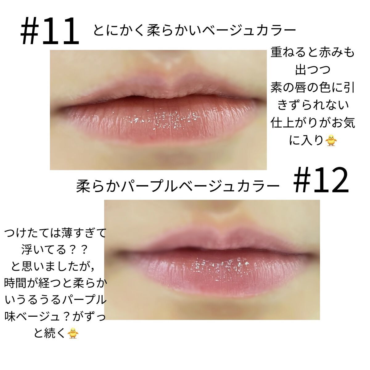 このティントは安くて優秀なので3色目?とかです😆 11番はスウォッチだと黄みが強く見えますが、唇に塗ると元の赤みと混ざって粘膜ベージュっぽく発色してくれます。 色持ちが良いので仕込みにも使えるし、グロスいらずのツヤが出るのでこれ1本でも使えるティントです。 ほんのり甘いフルーツ?お菓子?みたいな香りが付いてます!