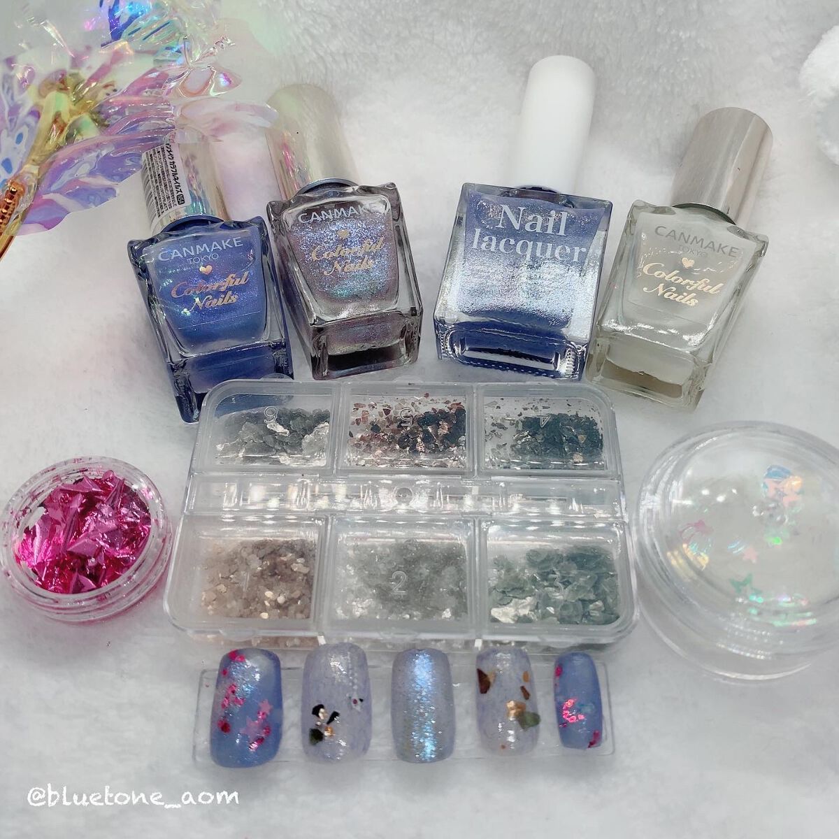 ラメがしっかりしてるし クリアカラーが入ってるから オーロラパウダー無しでも 充分キラキラしました! 反射強めのフィルムなので 実物はもっと うるうるとキラキラが強いです! ビー玉みたい🥺 ネイルシール長持ちさせたいけど ちょっと飽きてきたな〜って時とかに 全然違った印象になるのでオススメです! Seriaのベースジェル 本当にうるうるネイルしやすいので オススメしたい🙆♀️
