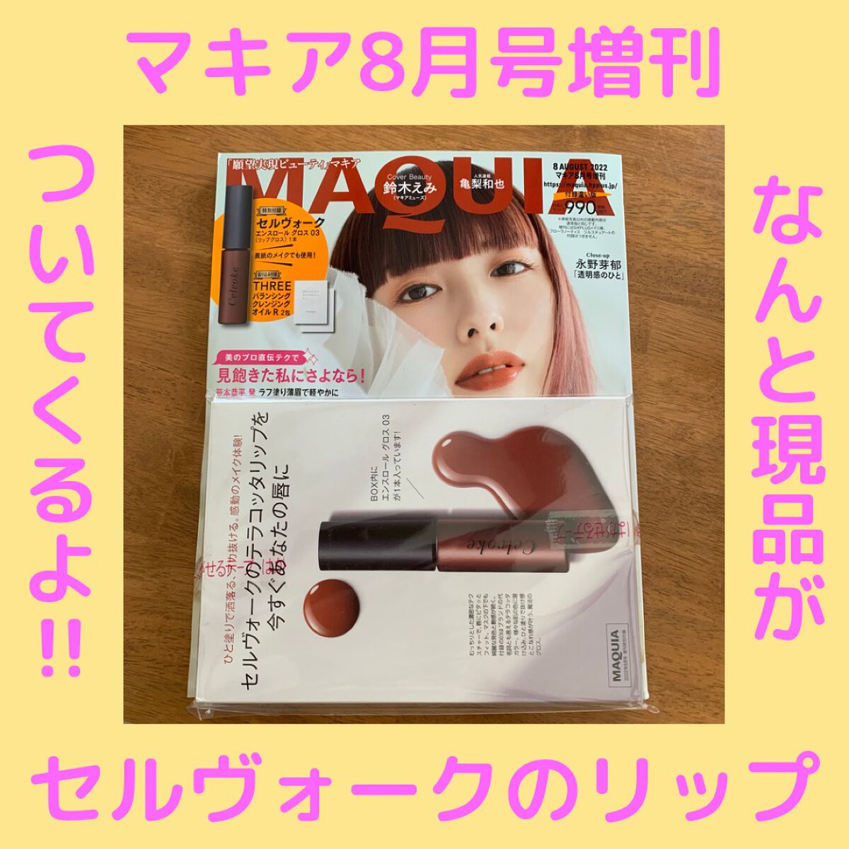 MAQUIA8月号付録違い版にセルヴォークのグロス現品がついてきた❤️セルヴォークエンスロールグロス03テラコッタこちらは、セルヴォークのエンスロールグロスの不動の大人気カラーグロスなのにまるでリップスティックのようにはっきりと色づくぽってり...