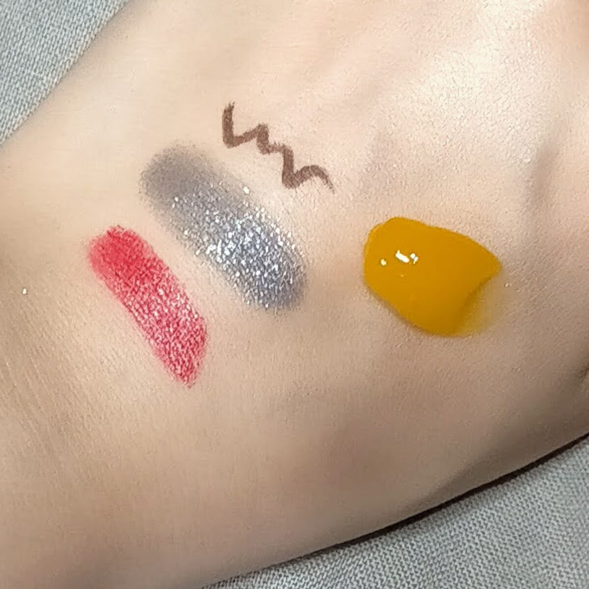 全部ラメ!キラキラ好き大歓喜のパレット😍😍😍 左下2色のグリッターはしっとりぺたぺたしている質感で瞼にしっかりくっついてくれます! ざっくり言うと上段はキラキラ中段はツヤツヤ下段はギラギラというイメージです。 全体的に色づきは控えめでラメ感を楽しめる🥳 全部キラッキラの宝石みたいな多色ラメですが、上段は青ラメ、中段はピンクラメ、下段はゴールドラメが目立つなーと思いました💖 名前も可愛い☁