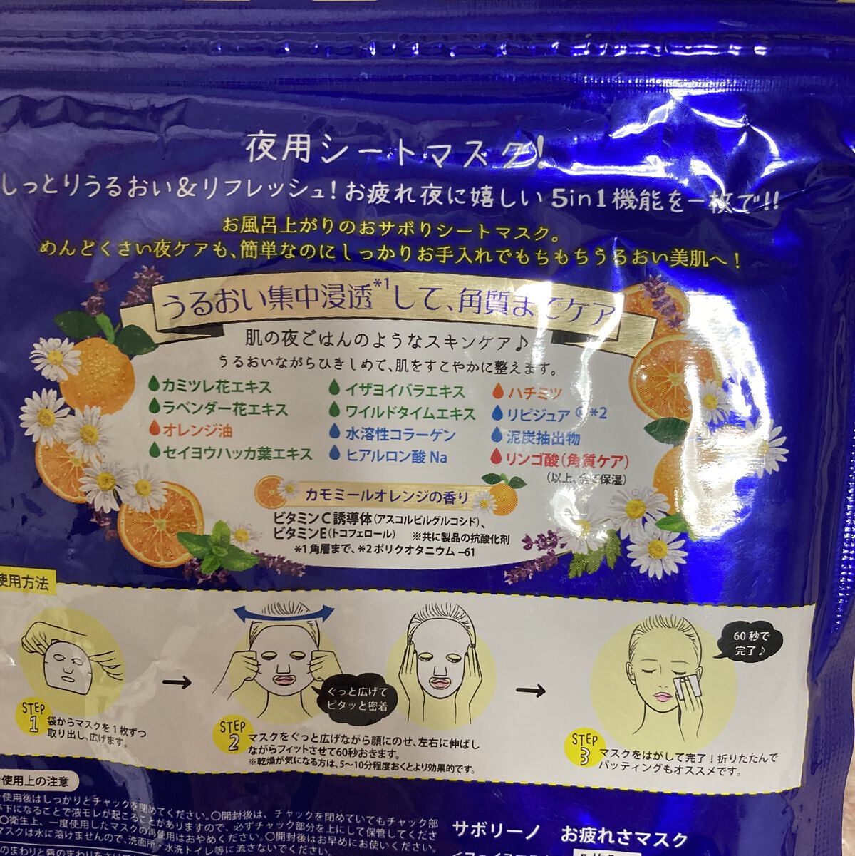 - お疲れ夜に嬉しい5in1機能を一枚で(化粧水 + 乳液 + 美容液 + クリーム + パック) しっとりうるおい&スッキリ引き締め感で、気持ちも肌もリフレッシュ!めんどくさい夜ケアも、簡単なのにしっかりお手入れ。カミツレ花エキス、ラベンダー花エキス、オレンジ油、セイヨウハッカ葉エキス、など肌の夜ごはんのような保湿成分を配合。爽やかなカモミールオレンジの香りに包まれて、ゆったり心地よい時間をお過ごしください。