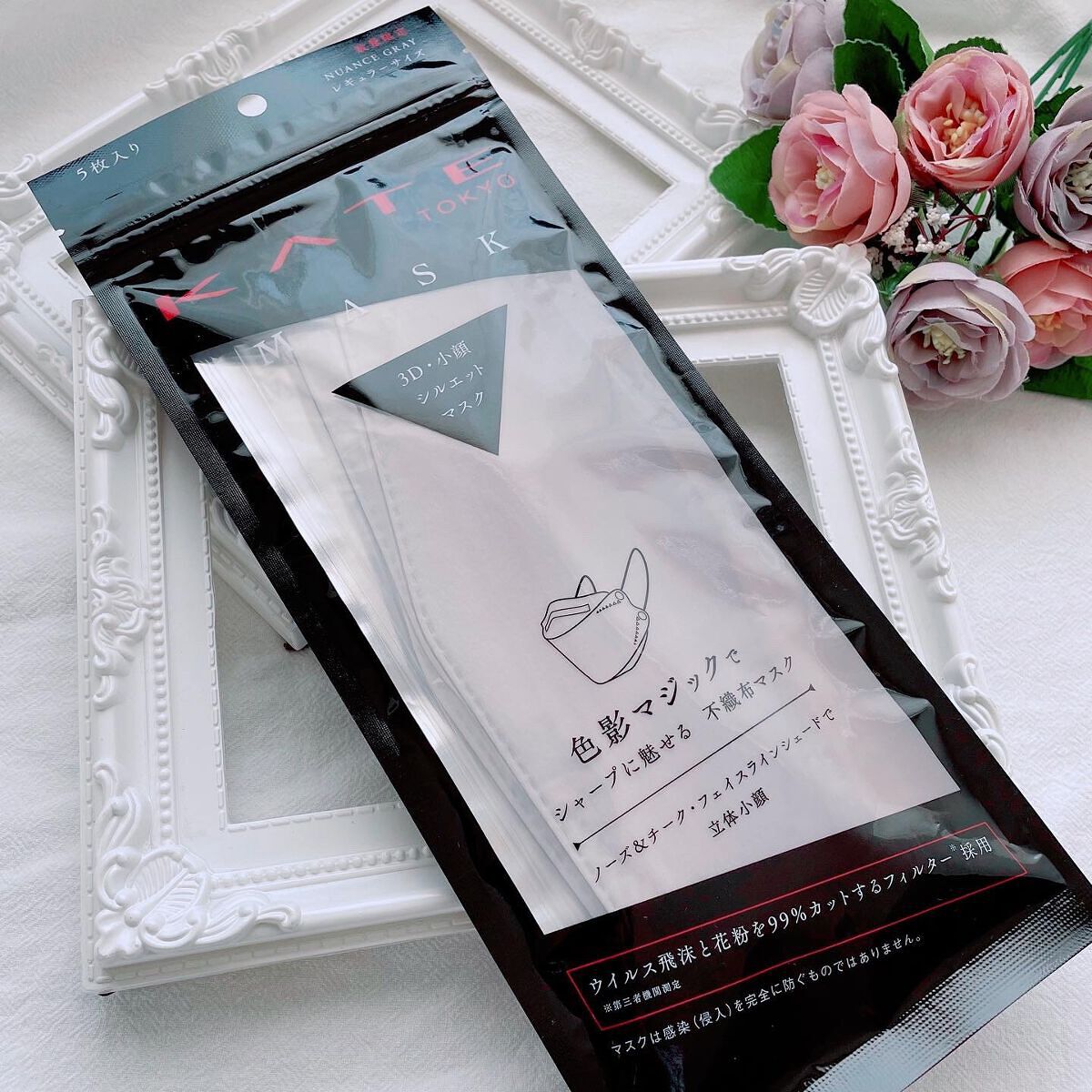 - 数量限定発売 色影マジックでシャープに魅せる3D 小顔シルエット不織布マスク。 ○5枚入り(個別包装) ○レギュラーサイズ ◆高性能4層フィルターでブロック ◆やわらかく心地よい感触の不織布 ◆やわらかいゴムひもで耳が痛くなりにくい