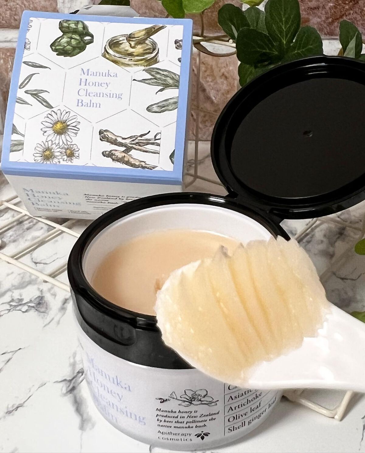 マヌカハニークレンジングバーム🍯.付属のスパチュラでバームを肌にのせて、肌温にとろりととろけるバームは、メイクの上でくるくるするとスルスルメイクと馴染む❤︎.マヌカハニーのおかげか、私は洗い上がりのしっとり感が感じられて満足🫶.抗菌成分を含む...