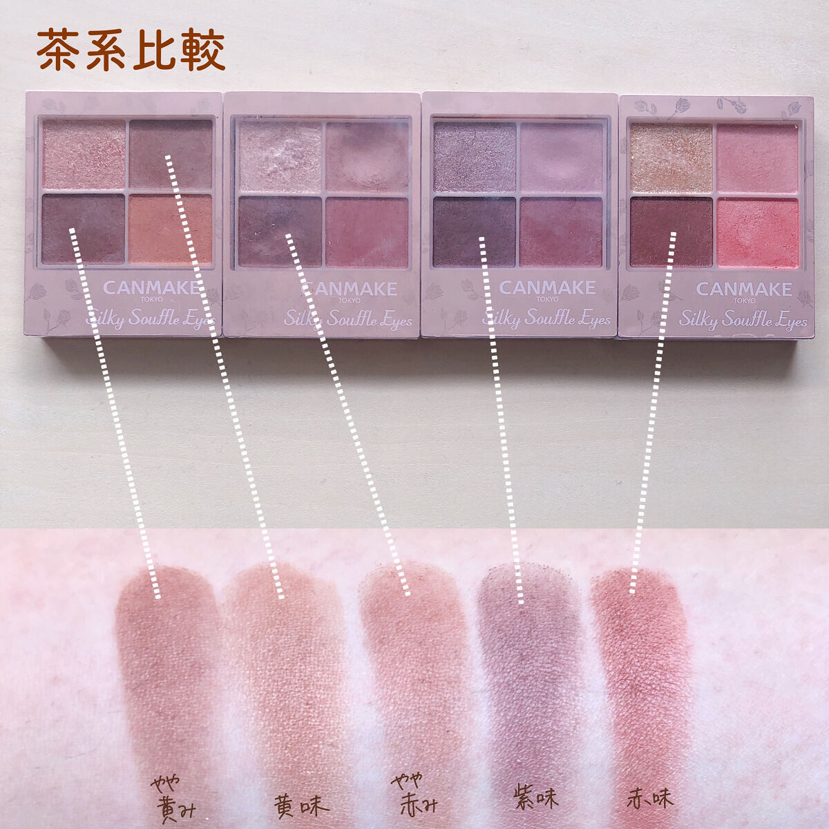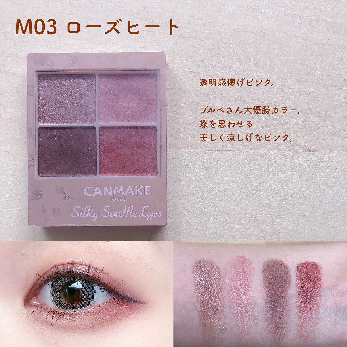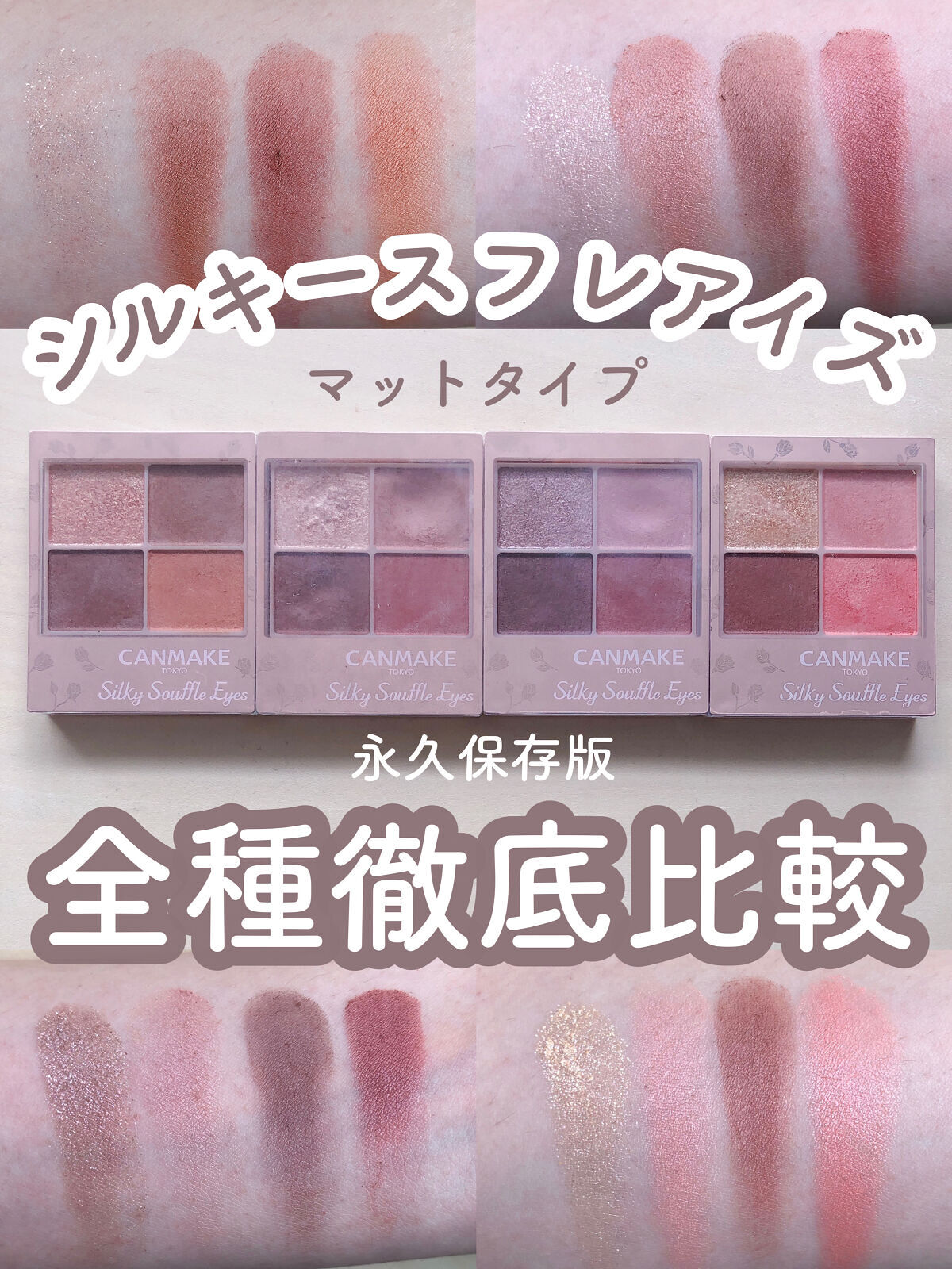 - シルキースフレアイズの姉妹品♡ 肌に溶け込むような透けマットシャドウ 透け感のある柔らかい仕上がりになるマット3色と、透け発色の繊細ラメ1色のパレットシャドウ♡ 完全マットアイや、ラメ×マットアイなど、メイクのパターンを楽しみましょう!