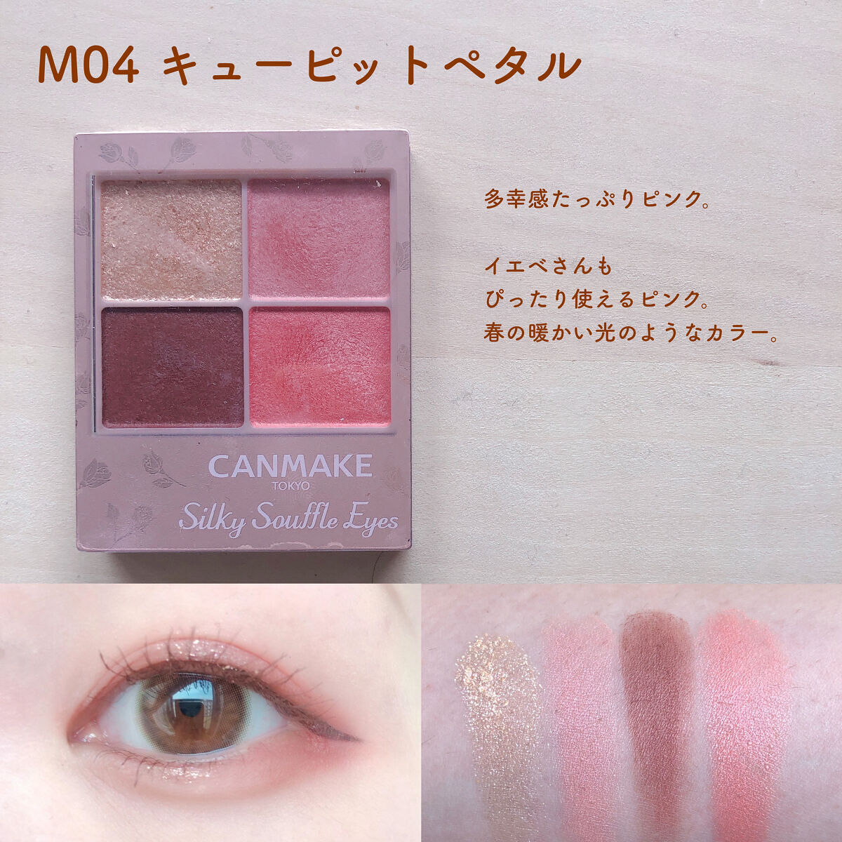 キャンメイク シルキースフレアイズマットタイプ今回はキャンメイクのシルキースフレアイズマットタイプ、"M02チャイブリック"をご紹介します✦質感✦マットアイシャドウ3色+ラメの4色パレットマットアイシャドウは韓国コスメのような完全にマットな質...