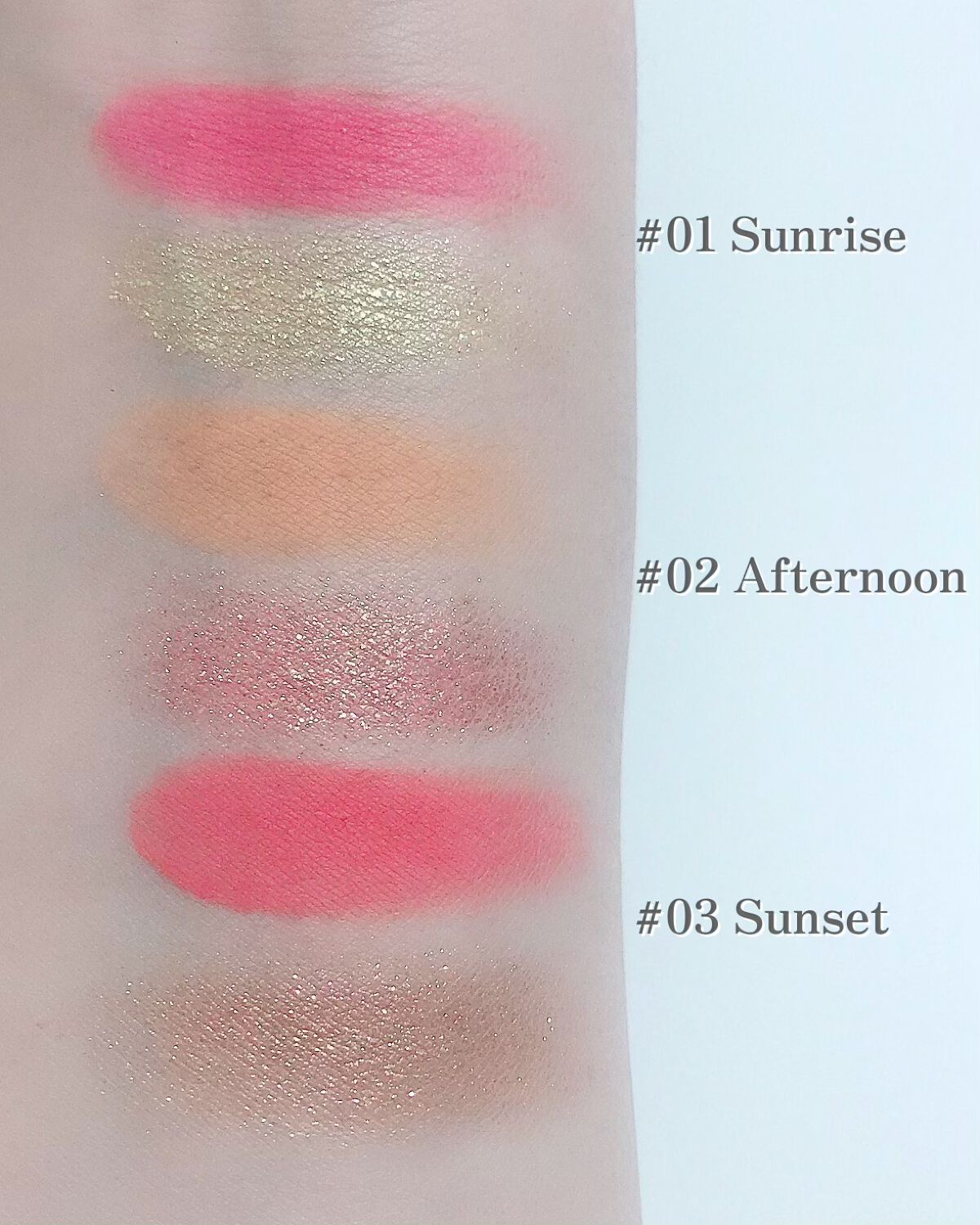 シマーな質感がとっても発色がよく、肌にしっかり密着してくれる感じがありました! 01 ベビーピンク 3色の中で一番ピンクみと青みがあるパレット!! 今回の新作の中で、一番シマーのカラーがしっかり高発色してくれるパレットだと感じました!!