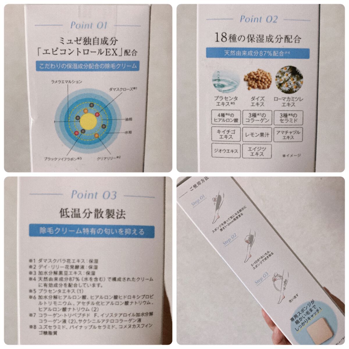 - 【医薬部外品】 ミュゼの本格美肌除毛クリーム。 最短5分(*1)でサロン品質のムダ毛ケアがご自宅でも。 こだわりの独自成分エピコントロールEX(*2)と18種類の保湿成分を配合。 天然由来成分87%(*3)配合で、肌にやさしい使い心地です。 大きくなった塗布&ふき取り専用スポンジがムダ毛をキャッチ。 細い毛から太い毛までしっかりキャッチします。 ツンとしたニオイを抑えた低温分散製法採用なのでケアも快適。 ホワイトシトラスの香り。 *1.個人差はあります *2.保湿成分 *3.天然由来成分87%(水を含む)クリームに有効成分を配合しています。