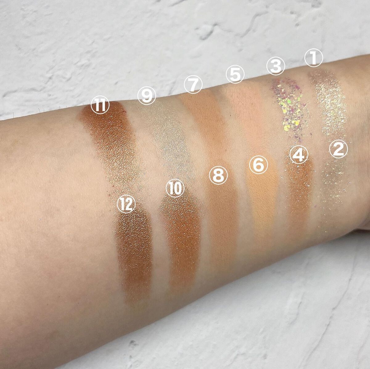 テクスチャーはサラサラだけど、飛び散るわけではなくて吸い付いてくる感じでした。 グリッターは、湿式のウェットさと押すとムニっとして、ちょっとゼリーテイストな気がします。ギラギラすぎなくて使いやすかったです。 ⑥はピンクも混ざっていてとても可愛い。アイスクリーム屋さんのストロベリーチーズケーキみたいな🍓これも、白すぎなくて肌馴染みの良い白系なので使いやすかったです。