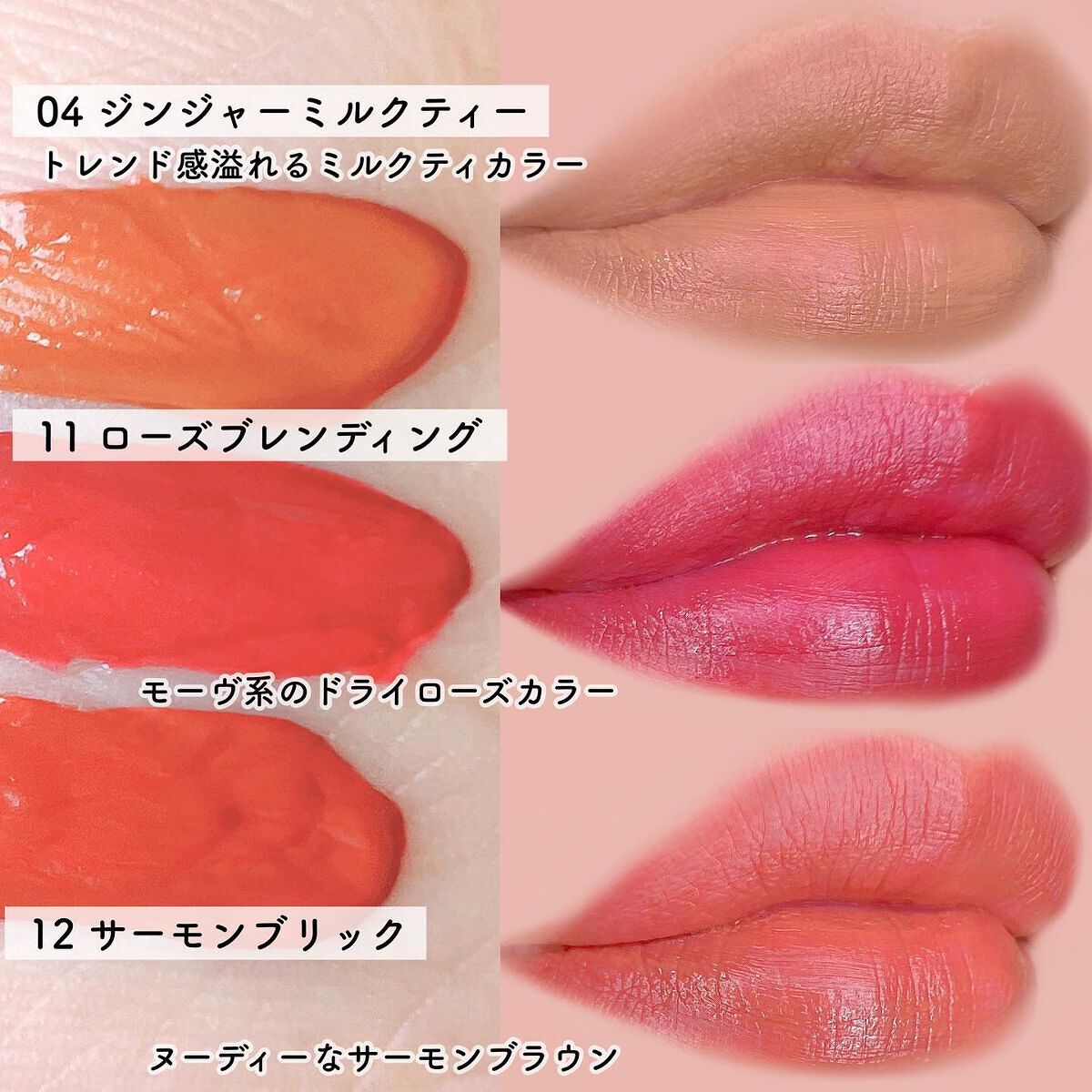 派手になりすぎない仕上がり💖 リップクリームのような保湿感に加えてするすると塗れる使用感もとても好きでついつい手に取ってしまいます💄✨ 全てのカラーをパーソナルカラー仕分けしてみましたのでぜひ保存して参考にしてみてください🌈