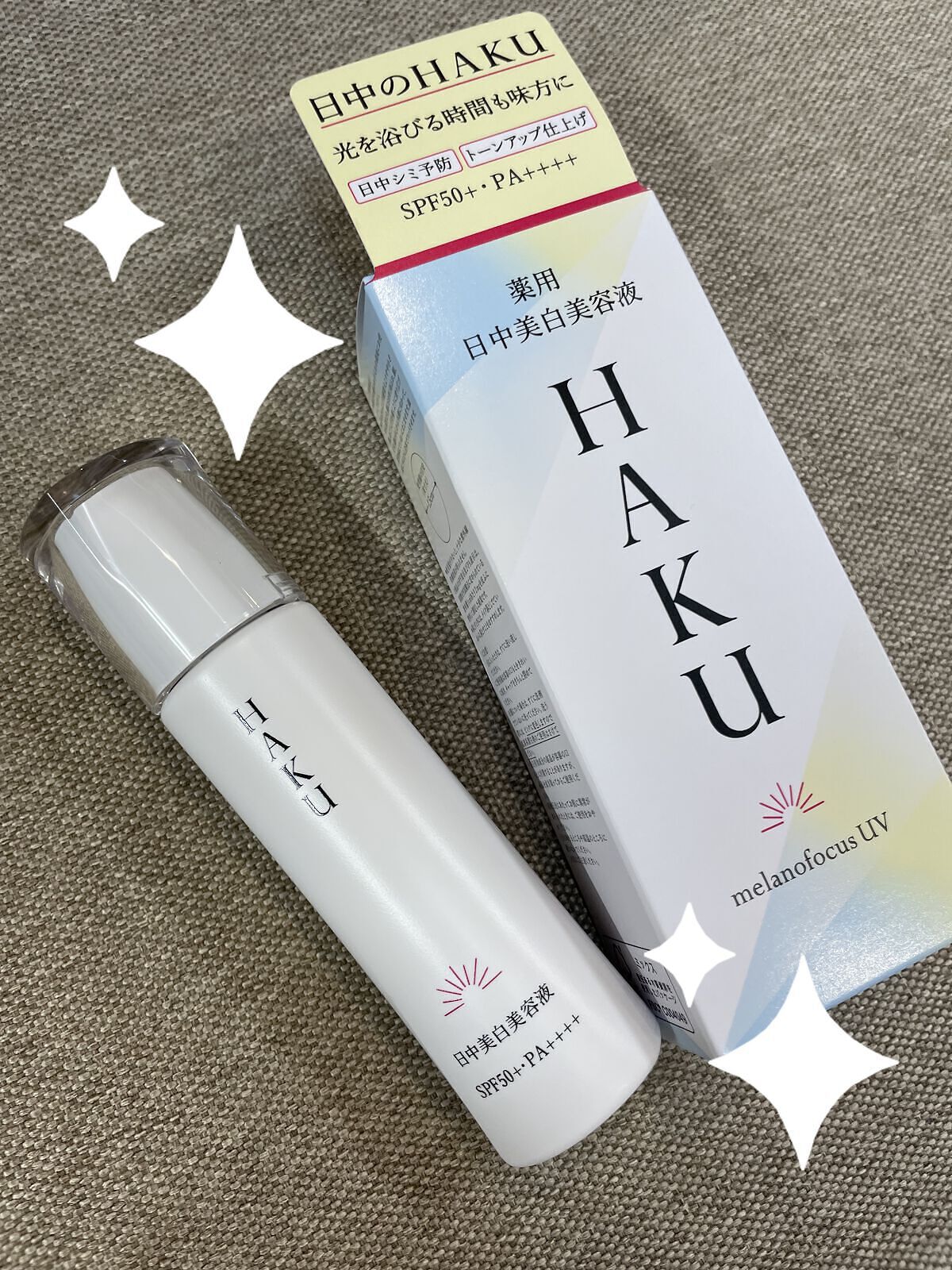 - 販売名「メラノフォーカスUV」 SPF50+・PA++++ 日中のHAKU。光を浴びる時間も味方に、日中だからできる美白ケアのアプローチ。 シミ予防研究の先端技術を搭載し、日中ならではの美白ケアを可能にした、薬用日中美白美容液です。光を浴びる時間も味方にして、明るく透明感のある肌に導きます。 ○2種の美白有効成分を肌の奥まで届け効かせる。 ○日中の肌環境に着目し、Wデイエフェクターを配合。うるおいを与え届ける。 〇ファインレッドパールαが効果的に光を放ち、シミや色ムラを目立たせない。トーンアップ効果で、明るく透明感のある仕上がり。 〇みずみずしい美容液がスーッとなじむ。化粧下地としても使える。 ○無香料・アレルギーテスト済み・ニキビのもとになりにくい処方。 (全てのかたにアレルギーが起きない、ニキビができないというわけではありません)。