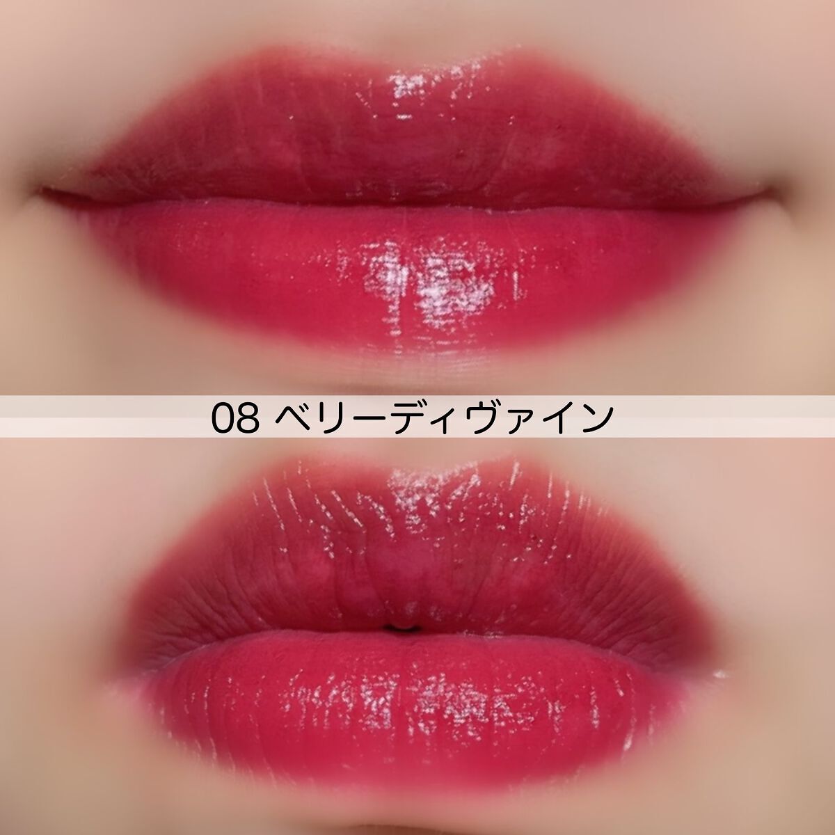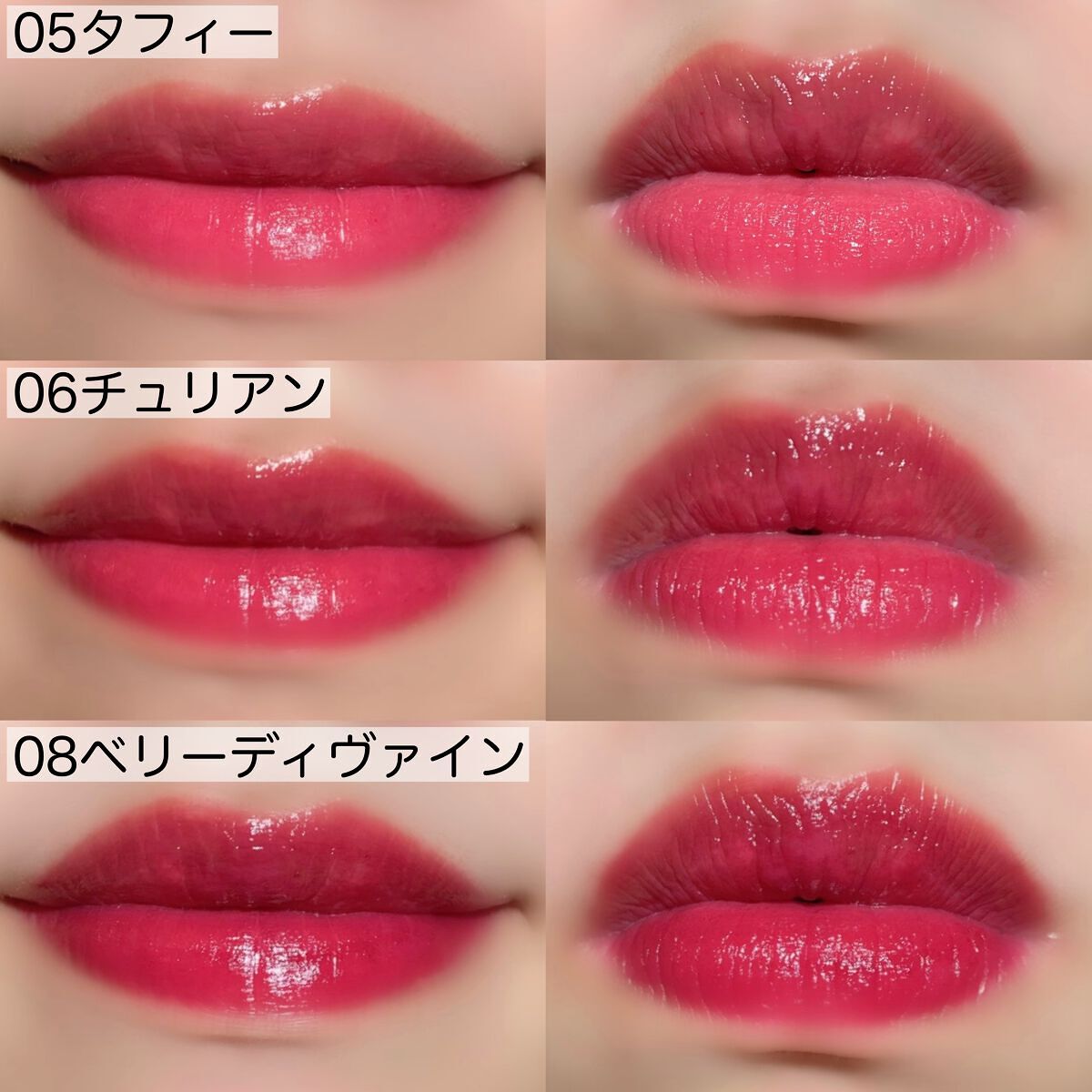 - <01 インコーラル> 水、ビスジグリセリルポリアシルアジペート-2、グリセリン、ジフェニルジメチコン、ジフェニルシロキシフェニルトリメチコン、ポリグリセリン-3、リンゴ酸ジイソステアリル、水添ポリイソブテン、ポリブテン、トリメチルシロキシフェニルジメチコン、変性アルコール、ポリソルベート60、イソノナン酸イソノニル、ペンチレングリコール、(アクリル酸ヒドロキシエチル/アクリロイルジメチルタウリンNa)コポ リマー、ラベンダーエキス、ハナハッカ花/葉/茎エキス、ローズマリーエキス、タイムエキス、ステアリン酸グリセリル、ステアリン酸PEG-100、スクワラン、ラウリルPEG-10トリス(トリメチルシロキシ)シリルエチルジメチコン、エチルヘキシルグリセリン、デキストリン、ステビオシド、イソステアリン酸ソルビタン、エチレンジアミンジコハク酸3Na、水酸化Al、ポリアクリル酸アンモニウム、BG、トコフェロール、フェノキシエタノール、香料、リモネン、酸化チタン、黄5、赤227、黄4、青1 <03 イフローズ> 水、ビスジグリセリルポリアシルアジペート-2、グリセリン、ジフェニルジメチコン、ジフェニルシロキシフェニルトリメチコン、ポリグリセリン-3、リンゴ酸ジイソステアリル、水添ポリイソブテン、ポリブテン、トリメチルシロキシフェニルジメチコン、変性アルコール、ポリソルベート60、イソノナン酸イソノニル、ペンチレングリコール、(アクリル酸ヒドロキシエチル/アクリロイルジメチルタウリンNa)コポリマー、ラベンダーエキス、ハナハッカ花/葉/茎エキス、ローズマリーエキス、タイムエキス、ステアリン酸グリセリル、ステアリン酸PEG-100、スクワラン、ラウリルPEG-10トリス(トリメチルシロキシ)シリルエチルジメチコン、エチルヘキシルグリセリン、デキストリン、ステビオシド、トリイソステアリン酸ポリグリセリル-2、イソステアリン酸ソルビタン、エチレンジアミンジコハク酸3Na、水酸化Al、ポリアクリル酸アンモニウム、BG、トコフェロール、フェノキシエタノール、香料、リモネン、酸化チタン、黄5、赤227、青1、黄4、赤218 <04 チリアップ> 水、ビスジグリセリルポリアシルアジペート-2、グリセリン、ジフェニルジメチコン、ジフェニルシロキシフェニルトリメチコン、ポリグリセリン-3、リンゴ酸ジイソステアリル、水添ポリイソブテン、ポリブテン、トリメチルシロキシフェニルジメチコン、変性アルコール、ポリソルベート60、イソノナン酸イソノニル、ペンチレングリコール、(アクリル酸ヒドロキシエチル/アクリロイルジメチルタウリンNa)コポ リマー、ラベンダーエキス、ハナハッカ花/葉/茎エキス、ローズマリーエキス、タイムエキス、ステアリン酸グリセリル、ステアリン酸PEG-100、スクワラン、ラウリルPEG-10トリス(トリメチルシロキシ)シリルエチルジメチコン、エチルヘキシルグリセリン、デキストリン、ステビオシド、イソステアリン酸ソルビタン、エチレンジアミンジコハク酸3Na、トコフェロール、BG、フェノキシエタノール、料、リモネン、黄5、赤227、黄4、青1 <06 チュリアン> 水、ビスジグリセリルポリアシルアジペート-2、グリセリン、ジフェニルジメチコン、ジフェニルシロキシフェニルトリメチコン、ポリグリセリン-3、リンゴ酸ジイソステアリル、水添ポリイソブテン、ポリブテン、トリメチルシロキシフェニルジメチコン、変性アルコール、ポリソルベート60、イソノナン酸イソノニル、ペンチレングリコール、(アクリル酸ヒドロキシエチル/アクリロイルジメチルタウリンNa)コポリマー、ラベンダーエキス、ハナハッカ花/葉/茎エキス、ローズマリーエキス、タイムエキス、ステアリン酸グリセリル、ステアリン酸PEG-100、スクワラン、ラウリルPEG-10トリス(トリメチルシロキシ)シリルエチルジメチコン、エチルヘキシルグリセリン、デキストリン、ステビオシド、イソステアリン酸ソルビタン、エチレンジアミンジコハク酸3Na、水酸化Al、ポリアクリル酸アンモニウム、BG、トコフェロール、フェノキシエタノール、香料、リモネン、酸化チタン、黄5、赤227、酸化鉄、黄4、赤218、青1 <08 ベリーディヴァイン> 水、ビスジグリセリルポリアシルアジペート-2、グリセリン、ジフェニルジメチコン、ジフェニルシロキシフェニルトリメチコン、ポリグリセリン-3、リンゴ酸ジイソステアリル、水添ポリイソブテン、ポリブテン、トリメチルシロキシフェニルジメチコン、変性アルコール、ポリソルベート60、イソノナン酸イソノニル、ペンチレングリコール、(アクリル酸ヒドロキシエチル/アクリロイルジメチルタウリンNa)コポリマー、ラベンダーエキス、ハナハッカ花/葉/茎エキス、ローズマリーエキス、タイムエキス、ステアリン酸グリセリル、ステアリン酸PEG-100、スクワラン、ラウリルPEG-10トリス(トリメチルシロキシ)シリルエチルジメチコン、エチルヘキシルグリセリン、イソステアリン酸ソルビタン、デキストリン、ステビオシド、エチレンジアミン