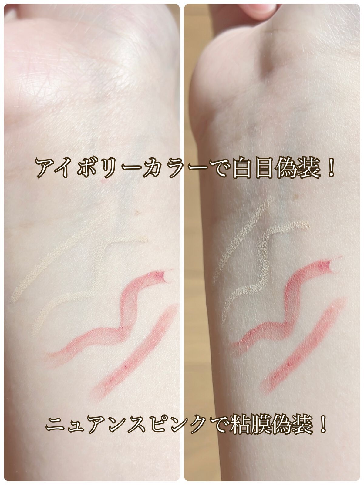 - 下まぶたにアイボリーカラーとニュアンスピンクカラーの2色を塗ることで、目幅を拡張し、白目を自然に大きく見せるWエンドの白目強調※アイライナー。 白目強調・たれ目強調・目幅拡張。 ※下まぶたへのメイクアップ効果による