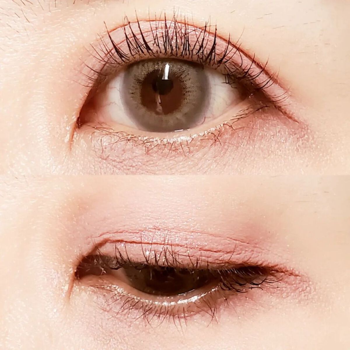 なんとなくだけど左側がブルベ寄り、右側がイエベ寄りの色味でニュートラルなパレットかなと思いました。 目元写真みると発色薄く見えるかなとおもいますが朝メイクして、直さず夜に撮ったのでこんな感じです。 カラコンはmimucoのブラウンフォンデュミムコのカラコンはどれも自然でかわいいです。
