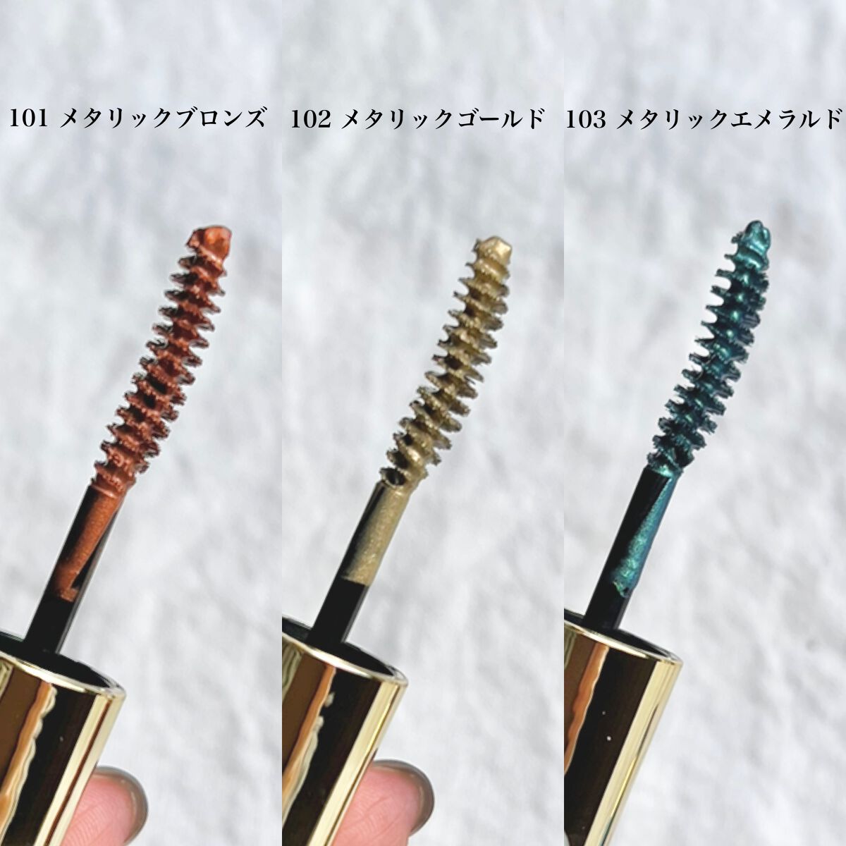 - <101 メタリックブロンズ> 水、(アクリレーツ/アクリル酸エチルヘキシル)コポリマー、BG、ミツロウ、カルナウバロウ、ステアリン酸、シリカ、TEA、PVP、ジフェニルシロキシフェニルトリメチコン、ステアリン酸ソルビタン、パルミチン酸、ワセリン、(HDI/トリメチロールヘキシルラクトン)クロスポリマー、ジメチコン、ポリソルベート60、ミリスチン酸、ラウレス-21、フェノキシエタノール、エチルヘキシルグリセリン、メチルパラベン、ヒドロキシエチルセルロース、トコフェロール、パンテノール、グリセリン、加水分解コラーゲン、PCA-Na、乳酸Na、ヒアルロン酸Na、リンゴ果実培養細胞エキス、アルギニン、アスパラギン酸、PCA、ローズマリー葉エキス、ビワ葉エキス、マグワ根皮エキス、グリシン、アラニン、キサンタンガム、センチフォリアバラ花エキス、ブドウ葉エキス、加水分解コンキオリン、セリン、ノイバラ果実エキス、バリン、イソロイシン、トレオニン、プロリン、ヒスチジン、フェニルアラニン、レシチン、ユズ果実エキス、ビオチノイルトリペプチド-1、酸化鉄、Al、マイカ、タルク <102 メタリックゴールド> 水、(アクリレーツ/アクリル酸エチルヘキシル)コポリマー、BG、ミツロウ、カルナウバロウ、ステアリン酸、シリカ、TEA、PVP、ジフェニルシロキシフェニルトリメチコン、ステアリン酸ソルビタン、パルミチン酸、ワセリン、(HDI/トリメチロールヘキシルラクトン)クロスポリマー、ジメチコン、ポリソルベート60、ミリスチン酸、ラウレス-21、フェノキシエタノール、エチルヘキシルグリセリン、メチルパラベン、ヒドロキシエチルセルロース、トコフェロール、パンテノール、グリセリン、加水分解コラーゲン、PCA-Na、乳酸Na、ヒアルロン酸Na、リンゴ果実培養細胞エキス、アルギニン、アスパラギン酸、PCA、ローズマリー葉エキス、ビワ葉エキス、マグワ根皮エキス、グリシン、アラニン、キサンタンガム、センチフォリアバラ花エキス、ブドウ葉エキス、加水分解コンキオリン、セリン、ノイバラ果実エキス、バリン、イソロイシン、トレオニン、プロリン、ヒスチジン、フェニルアラニン、レシチン、ユズ果実エキス、ビオチノイルトリペプチド-1、Al、マイカ、酸化鉄、タルク、酸化チタン <103 メタリックエメラルド> 水、(アクリレーツ/アクリル酸エチルヘキシル)コポリマー、BG、ミツロウ、カルナウバロウ、ステアリン酸、シリカ、TEA、PVP、ジフェニルシロキシフェニルトリメチコン、ステアリン酸ソルビタン、パルミチン酸、ワセリン、(HDI/トリメチロールヘキシルラクトン)クロスポリマー、ジメチコン、ポリソルベート60、ミリスチン酸、ラウレス-21、フェノキシエタノール、エチルヘキシルグリセリン、メチルパラベン、ヒドロキシエチルセルロース、トコフェロール、パンテノール、グリセリン、加水分解コラーゲン、PCA-Na、乳酸Na、ヒアルロン酸Na、リンゴ果実培養細胞エキス、アルギニン、アスパラギン酸、PCA、ローズマリー葉エキス、ビワ葉エキス、マグワ根皮エキス、グリシン、アラニン、キサンタンガム、センチフォリアバラ花エキス、ブドウ葉エキス、加水分解コンキオリン、セリン、ノイバラ果実エキス、バリン、イソロイシン、トレオニン、プロリン、ヒスチジン、フェニルアラニン、レシチン、ユズ果実エキス、ビオチノイルトリペプチド-1、Al、水酸化クロム、銀、グンジョウ、マイカ、タルク、酸化鉄、酸化スズ <104 メタリックピンク> 水、(アクリレーツ/アクリル酸エチルヘキシル)コポリマー、BG、ミツロウ、カルナウバロウ、ステアリン酸、TEA、PVP、ジフェニルシロキシフェニルトリメチコン、ステアリン酸ソルビタン、パルミチン酸、ワセリン、(HDI/トリメチロールヘキシルラクトン)クロスポリマー、ジメチコン、ポリソルベート60、ミリスチン酸、ラウレス-21、フェノキシエタノール、エチルヘキシルグリセリン、メチルパラベン、ヒドロキシエチルセルロース、トコフェロール、パンテノール、グリセリン、加水分解コラーゲン、PCA-Na、乳酸Na、ヒアルロン酸Na、リンゴ果実培養細胞エキス、アルギニン、アスパラギン酸、PCA、ローズマリー葉エキス、ビワ葉エキス、マグワ根皮エキス、グリシン、アラニン、キサンタンガム、センチフォリアバラ花エキス、ブドウ葉エキス、加水分解コンキオリン、セリン、ノイバラ果実エキス、バリン、イソロイシン、トレオニン、プロリン、ヒスチジン、フェニルアラニン、レシチン、ユズ果実エキス、ビオチノイルトリペプチド-1、合成フルオロフロゴパイト、シリカ、マイカ、タルク、酸化鉄、酸化チタン、AI、銀、水酸化AI、グンジョウ、赤226、酸化スズ <201 ブルージュブラック> 水、(アクリレーツ/アクリル酸エチルヘキシル)コポリマー、BG、ミツロウ、カルナウバロウ、ステアリン酸、TEA、PVP、ジフェニルシロキシフェニルトリメチコン、ステアリン酸ソルビタン、パルミチン酸、ワセリン、(HDI/トリメチロールヘキ