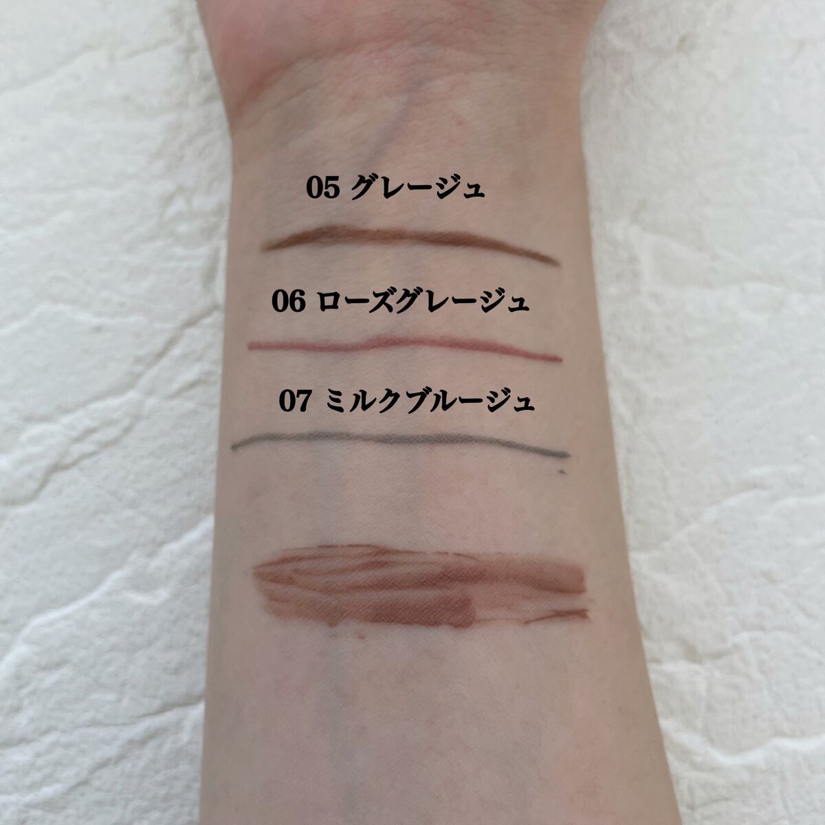 - <01 ブラック> 水、(アクリル酸エチルヘキシル/メタクリル酸メチル)コポリマー、BG、エタノール、(アクリレーツ/メチルスチレン/スチレン)コポリマーアンモニウム、カニナバラ果実エキス、サクシノイルアテロコラーゲン、パンテノール、ヒアルロン酸Na、(アクリレーツ/オクチルアクリルアミド)コポリマー、AMP、EDTA-2Na、TEA、ベヘネス-30、リン酸2Na、リン酸K、フェノキシエタノール、プロピルパラベン、メチルパラベン、安息香酸Na、安息香酸、カーボンブラック <02 ビターチョコブラウン> 水、(アクリル酸エチルヘキシル/メタクリル酸メチル)コポリマー、BG、(アクリレーツ/メチルスチレン/スチレン)コポリマーアンモニウム、カニナバラ果実エキス、サクシノイルアテロコラーゲン、パンテノール、ヒアルロン酸Na、(アクリレーツ/オクチルアクリルアミド)コポリマー、AMP、EDTA-2Na、TEA、エタノール、ベヘネス-30、ポリアスパラギン酸Na、リン酸2Na、リン酸K、フェノキシエタノール、プロピルパラベン、メチルパラベン、安息香酸Na、安息香酸、カーボンブラック、酸化鉄 <05 グレージュ> 水、(アクリル酸エチルヘキシル/メタクリル酸メチル)コポリマー、BG、炭、1,2-ヘキサンジオール、パンテノール、ヒアルロン酸Na、カニナバラ果実エキス、サクシノイルアテロコラーゲン、べへネス-25、ペンチレングリコール、エチルヘキシルグリセリン、カプリリルグリコール、ポリアスパラギン酸Na、EDTA-2Na、水酸化Al、グリセリン、ジラウロイルグルタミン酸リシンNa、べへネス-30、(アクリレーツ/メチルスチレン/スチレン)コポリマーアンモニウム、リン酸2Na、リン酸K、メチルパラベン、フェノキシエタノール、酸化チタン、酸化鉄 <10 セピアグレージュ> 水、(スチレン/アクリレーツ)コポリマーアンモニウム、BG、炭、1,2-ヘキサンジオール、パンテノール、ヒアルロン酸Na、カニナバラ果実エキス、サクシノイルアテロコラーゲン、水酸化Al、べへネス-25、べへネス-30、カプリリルグリコール、EDTA-2Na、エチルヘキシルグリセリン、グリセリン、ペンチレングリコール、ジラウロイルグルタミン酸リシンNa、ポリアスパラギン酸Na、リン酸K、リン酸2Na、フェノキシエタノール、メチルパラベン、酸化鉄、酸化チタン <06 ローズグレージュ> 水、アクリレーツコポリマー、BG、炭、1,2-ヘキサンジオール、パンテノール、ヒアルロン酸Na、カニナバラ果実エキス、サクシノイルアテロコラーゲン、べへネス-25、ペンチレングリコール、エチルヘキシルグリセリン、カプリリルグリコール、ポリアスパラギン酸Na、EDTA-2Na、水酸化Al、グリセリン、ジラウロイルグルタミン酸リシンNa、水酸化K、DPG、リン酸2Na、リン酸K、メチルパラベン、フェノキシエタノール、酸化チタン、赤226、酸化鉄