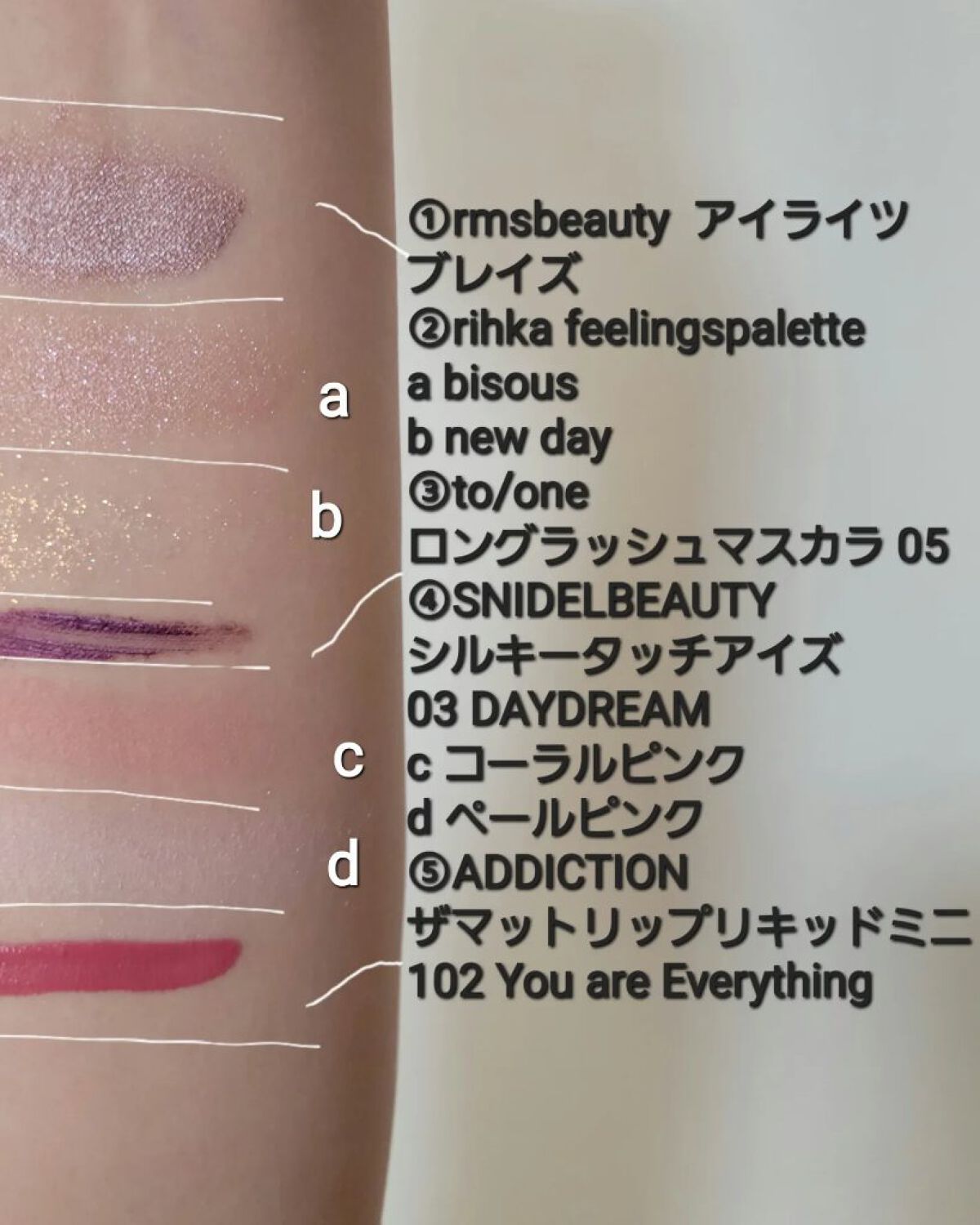 アイブロウは #WHOMEE のレッドブラウンを。 アイメイクは ①#hince の #ニューデップスアイシャドウ イニシャルを上下の瞼に馴染ませる。 ②#snidelbeauty の #フェイススタイリスト の a バーガンディを上瞼の際に 目尻から黒目上あたりまで。 b マスタードを同じく上瞼の際の目頭から 黒目上あたりまで。 c スパークリングゴールドを下瞼の黒目下に。 d フロステッドシルバーをcの両隣に✨ リップとチークは ④#rmsbeauty の #ラプチャー を唇にポンポン塗りにする。 指で馴染ませたら、指についてる残りを頬にも♡ ヘアスタイルは ちょっと変化を付けたくて 少しコテを使って ウルフっぽい形に。 アルジェランの ヘアバームとヘアオイルをほんの少し MIXしてスタイリング💆 #アルジェランヘアバーム → 9/11発売! #モイストグローヘアオイル →既に発売されているもの アウトバスだけでなくスタイリングにも オススメです🙆