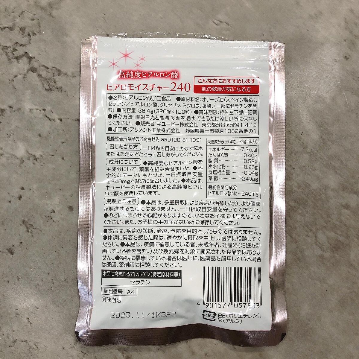 肌の乾燥と肌荒れ…一時期ひどくなってしまったので、化粧品だけでは間に合わないかも!と思い、サプリも始めました。 ヒアロモイスチャー240…あのキューピーが出している高濃度ヒアルロン酸。信頼できるブランドというのもあり、選びました。 PURE HADA...プラセンタとヒアルロン酸、ビタミン類が摂取できるサプリ。1日2粒でいいのも魅力です。