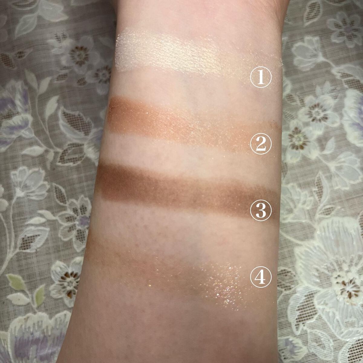 アイテム5つで完成!手軽に透明感メイク💫1目元全体に指で塗り広げる2目のキワから目尻に濃くなるように31のアイシャドウをアイホール縦に重ねる4グリッターを涙袋のハイライトにアイライナーとマスカラは濃いめのブラウンでしっかり目元が際立つメイクの...