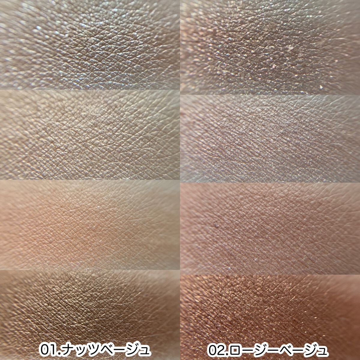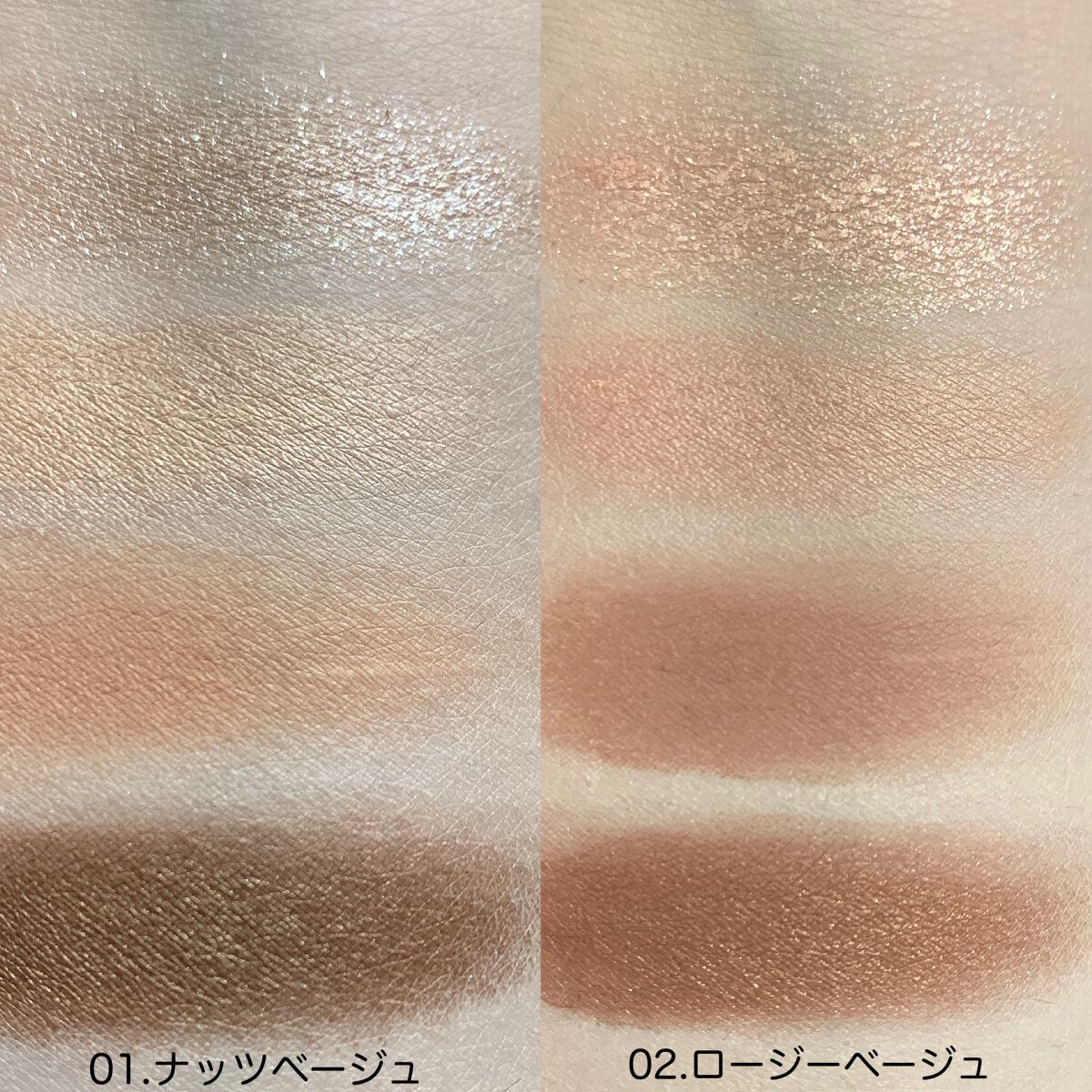 - ラメ・パール・マット3質感の4色アイシャドウ。 肌馴染みの良いベージュを基調としたカラー。ラメ・パール・マットの3質感を重ねて、自然にまぶたを強調し奥行のある大きな目元へ。 しっとり溶け込むような柔らかなパウダーなので、スルスル伸びてまぶたにピタッと密着。保湿成分(スクワラン・ホホバ種子油)配合。