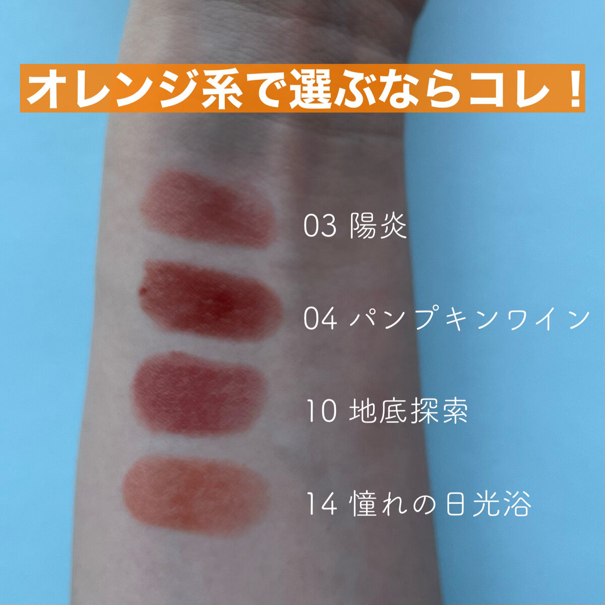 使ってみるとこれだけバズっている理由が分かります。確実にデパコスクオリティです。 まだまだ争奪戦が続いていてほとんど店舗で見かけることがないので、早く落ち着いて欲しいです。 03 陽炎 04 パンプキンワイン 05 ダークフィグ 06 2:00AM 07 ラスボス