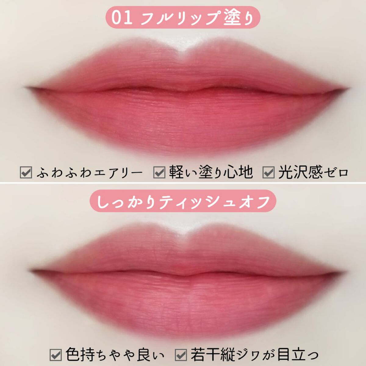 綿毛のように素肌に軽く密着しふわふわリップにしてくれるマットティント。 オイリー感の無い光沢ゼロの柔らかいベルベット質感です。 マットリップは苦手意識があってほとんど使ったことがなかったんですがふわふわな唇になってとっても可愛いです☺️