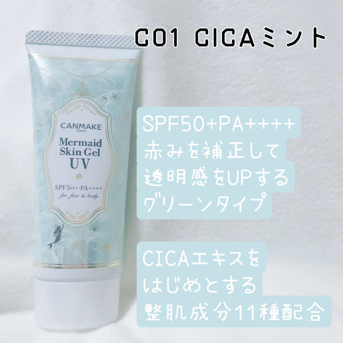 お待たせしてしまいました💦キャンメイクの化粧下地、マーメイドスキンジェルUVのレビューです。手持ちの色三種類を比較していきます❣️☑︎キャンメイクマーメイドスキンジェルUV02 ホワイトC01 CICAミントC03 ピュアパープル¥770・S...