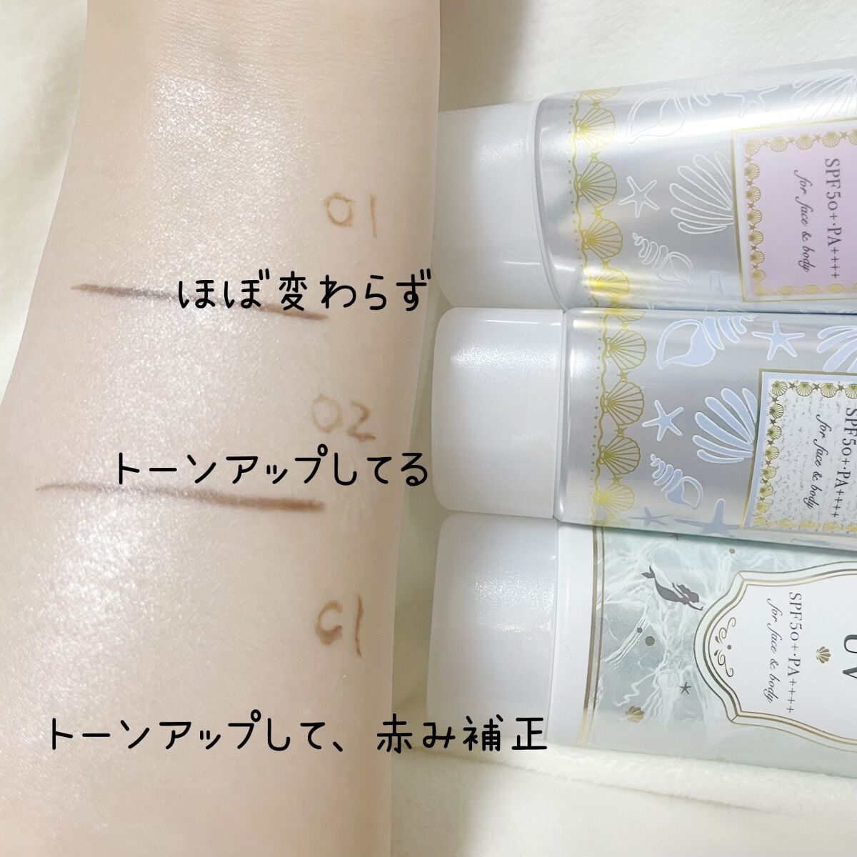 - パシャッと爽快!人魚姫気分♥化粧水感覚で使えるUVジェル 国内最強レベルのUVカット効果で紫外線から肌を守ります。 肌にのばすとパシャッとはじける水感ジェルでみずみずしく軽い仕上がり。 顔だけでなく全身にも使えます。 洗顔後、これ1本でスキンケア・保湿下地・UVカット下地としてご使用いただけます。 ※2~3時間ごとにこまめに塗り直しをしてください。 また、肌をタオル等で拭いた際も塗り直しを推奨いたします。