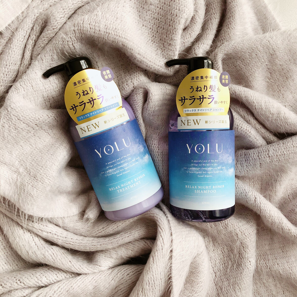 YOLU「リラックスナイトリペアシャンプー/トリートメント」✔️夜間美容でうねりをケアして※サラサラ髪へ導いてくれるそう✔️日中に受けた紫外線などによる地肌へのダメージ※1をケア。夜間の頭皮の乾燥を防いで、すこやかでうるおいのある状態をキープ...