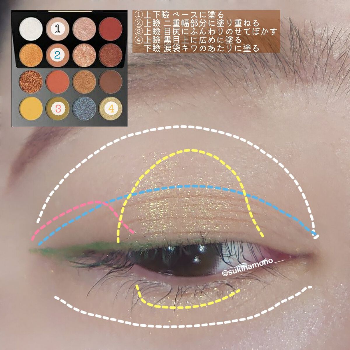 マイフェイブピースアイシャドウをベースに使う。ソフトブラーリングアイパレットのAを下まぶたベースへ。Bを重ねる。Cを上まぶたへ。 ラズル アイカラーを上まぶたへ重ねる。アイデザインライナーを下まぶたへほんのり入れてシルキーリキッドアイライナーWPを上へ。 ご覧頂きありがとうございました✨