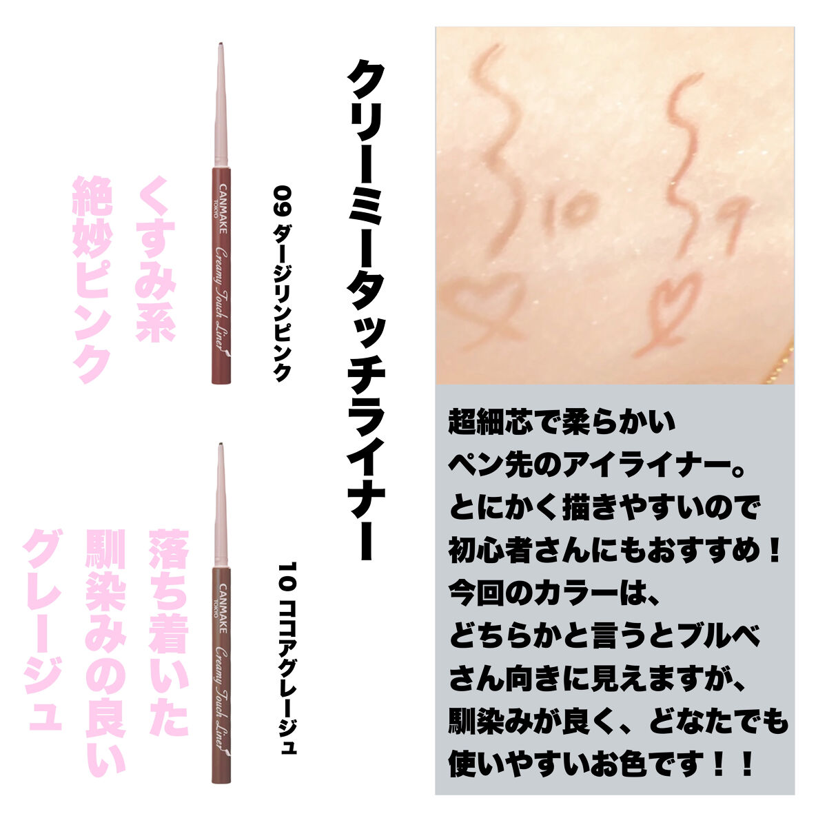 #クリーミータッチライナー#キャンメイク#粘膜アイライナー#正直レビュークリーミータッチライナー3色を比べてみました!09ダージリンピンクいちばんお気に入り🩷下瞼に引くと目が大きく見える〜☺️血色よく見えて暗くならない!10ココアグレージュや...