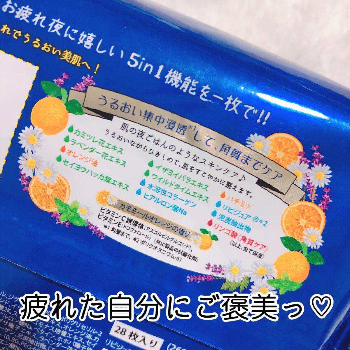 - お疲れ夜に嬉しい5in1機能を一枚で(化粧水 + 乳液 + 美容液 + クリーム + パック) しっとりうるおい&スッキリ引き締め感で、気持ちも肌もリフレッシュ!めんどくさい夜ケアも、簡単なのにしっかりお手入れ。カミツレ花エキス、ラベンダー花エキス、オレンジ油、セイヨウハッカ葉エキス、など肌の夜ごはんのような保湿成分を配合。爽やかなカモミールオレンジの香りに包まれて、ゆったり心地よい時間をお過ごしください。