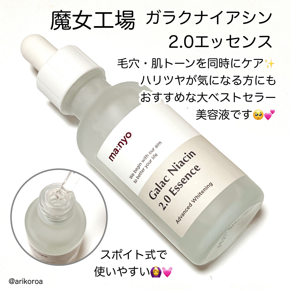 魔女工場ベストセラー美容液🎊 SNSでも良く見かけていたので気になっていました~🌟 高濃縮ガラクトミセスを93.69% 保湿成分ナイアシンアミドを4%配合。 水のようにサラッとしたテクスチャーでさっぱりとした使い心地。