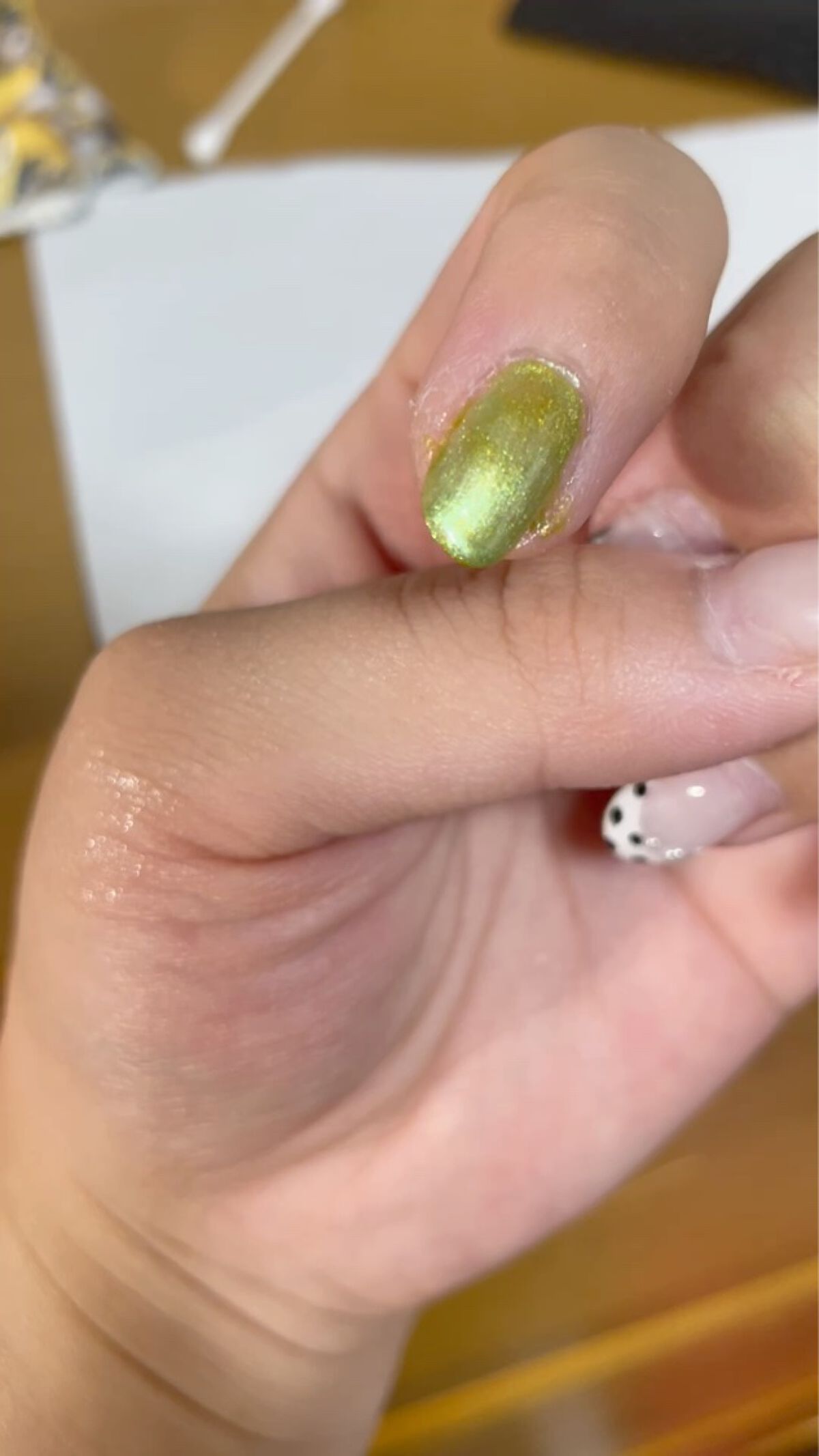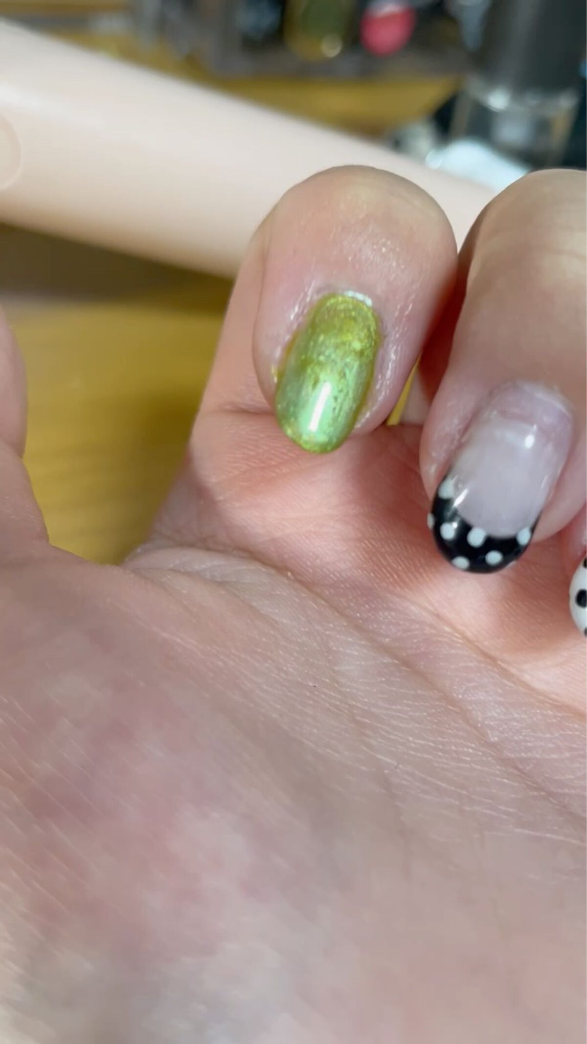 ◌.予約していたエレガンスラズルのポリッシュをお迎えしました💛シアーイエローに色んな形のホワイトホロ乱切りオーロラホロも隠れてます✨1度塗りして爪先にだけ2度塗り。トロピカルソーダみたいな仕上がりが夏っぽい。.@elegance.razzle...