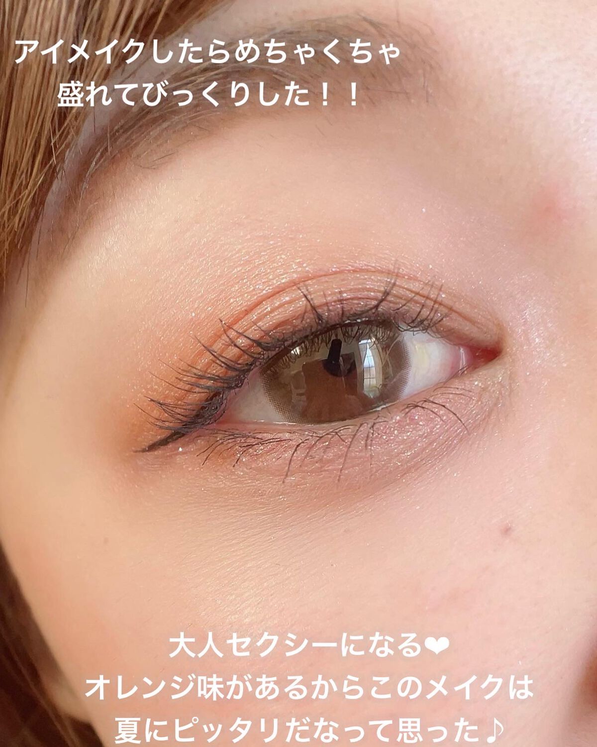 このアイシャドウは発色は薄めだけど その代わりにラメが凄くて!! なのでオレンジメイクしたいけど なかなか挑戦出来ない方とかにも◎ オレンジを単体で塗れば可愛い印象に ブラウンを加えれば大人っぽい印象に とっても可愛いアイシャドウなので 是非チェックしてみてください🍯💗