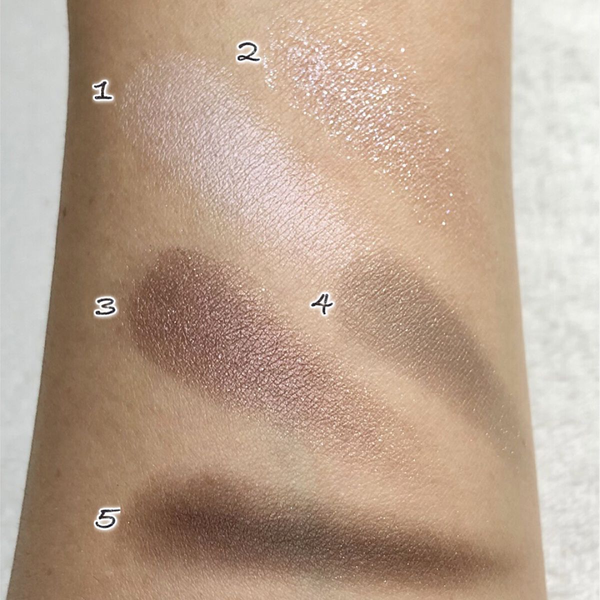 全体的には、名前のとおりヌーディーな印象☺️定番色「01 本命のブラウン」と似てるんだけど、今回の「104 本能のヌードベージュ」の方が、よりヌーディーなカラーとなっておりまする💁🏻♀️ 左上のベージュカラー(1番)は、基本的にはマットカラーなんだけど、ほんのりラメも入ってるから、のっぺりとした印象にならなくて良き🥰 4番のカラーは、ハイライトとして使うこともできるし、個人的には涙袋に使っても良いのではないかと思っておりまする👻 こちらは、全体的にしっとりとしたテクスチャーとなっておりまする💖そして、上2色のマットカラーが、結構しっかり発色してくれます❣️ 右下のハイライトカラーも、「104 本能のヌードベージュ」ほど白っぽくならないので、さりげなくハイライトを入れたい人にピッタリ✨