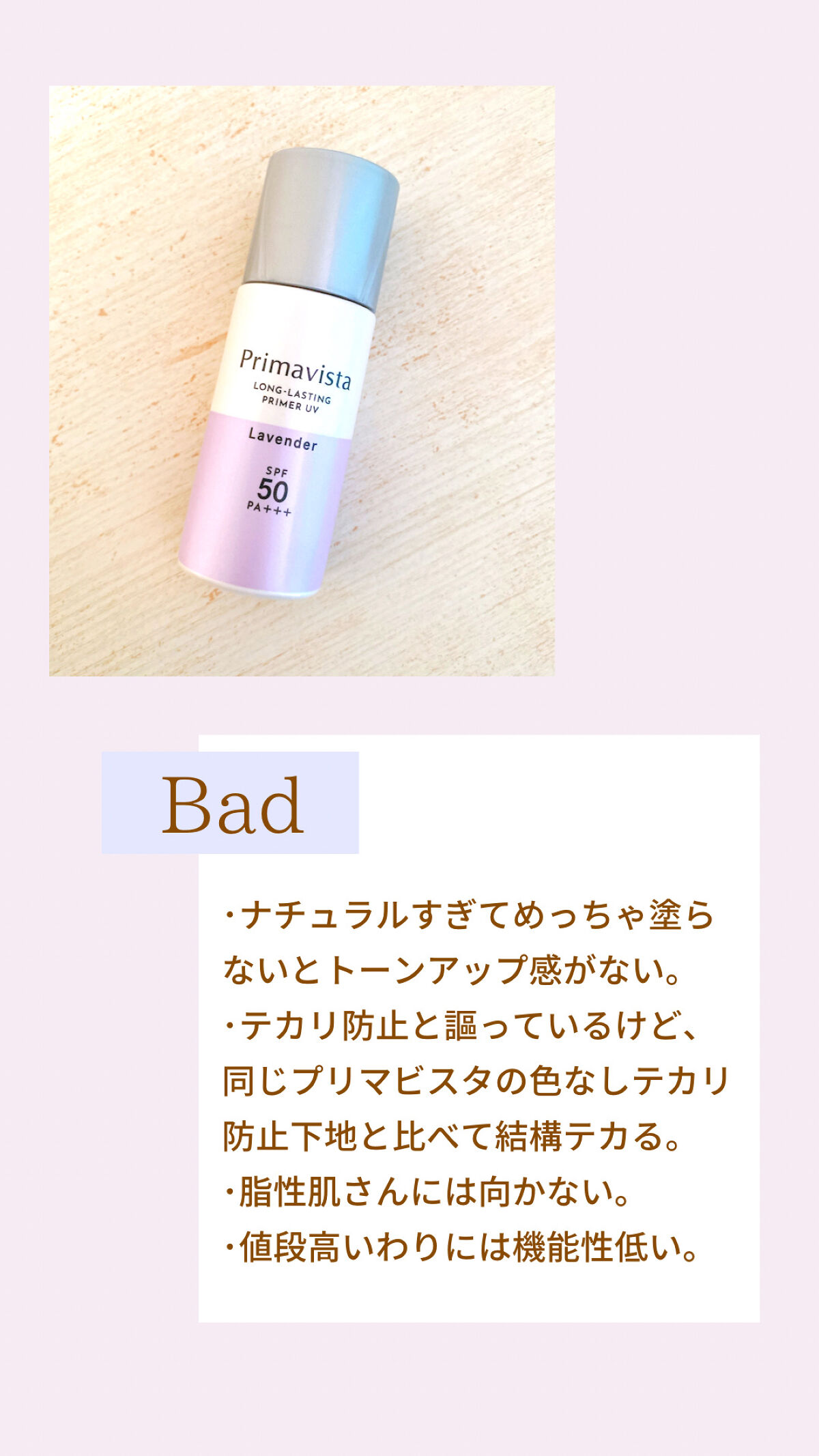 トーンアップさはナチュラル。 ナチュラルすぎるくらいですね😓 もう少しトーンアップ感があってもいいかな。 しっかりラベンダーの色が付いてるわりには 顔に塗ると馴染みすぎて大差ないです✋ ちゃんと透明感の出るベースメイクと併用しないと、黄ぐすみが気になる私には物足りなかったです。 テカリ防止と謳っていますが正直テカります。 脂性肌さんには向かないと思います。