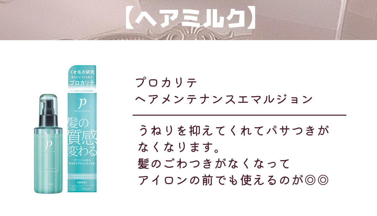 プロカリテの人気商品を紹介💡 ミルク状のエッセンスが髪の内部まで浸透して、しっとり保湿…✨ 重たくならず潤い感もあってサラサラなめらか〜な仕上がり感🙆♀️ パサつき・ハネを抑える事でまとまって見えるし、なんか良い女風の髪…←
