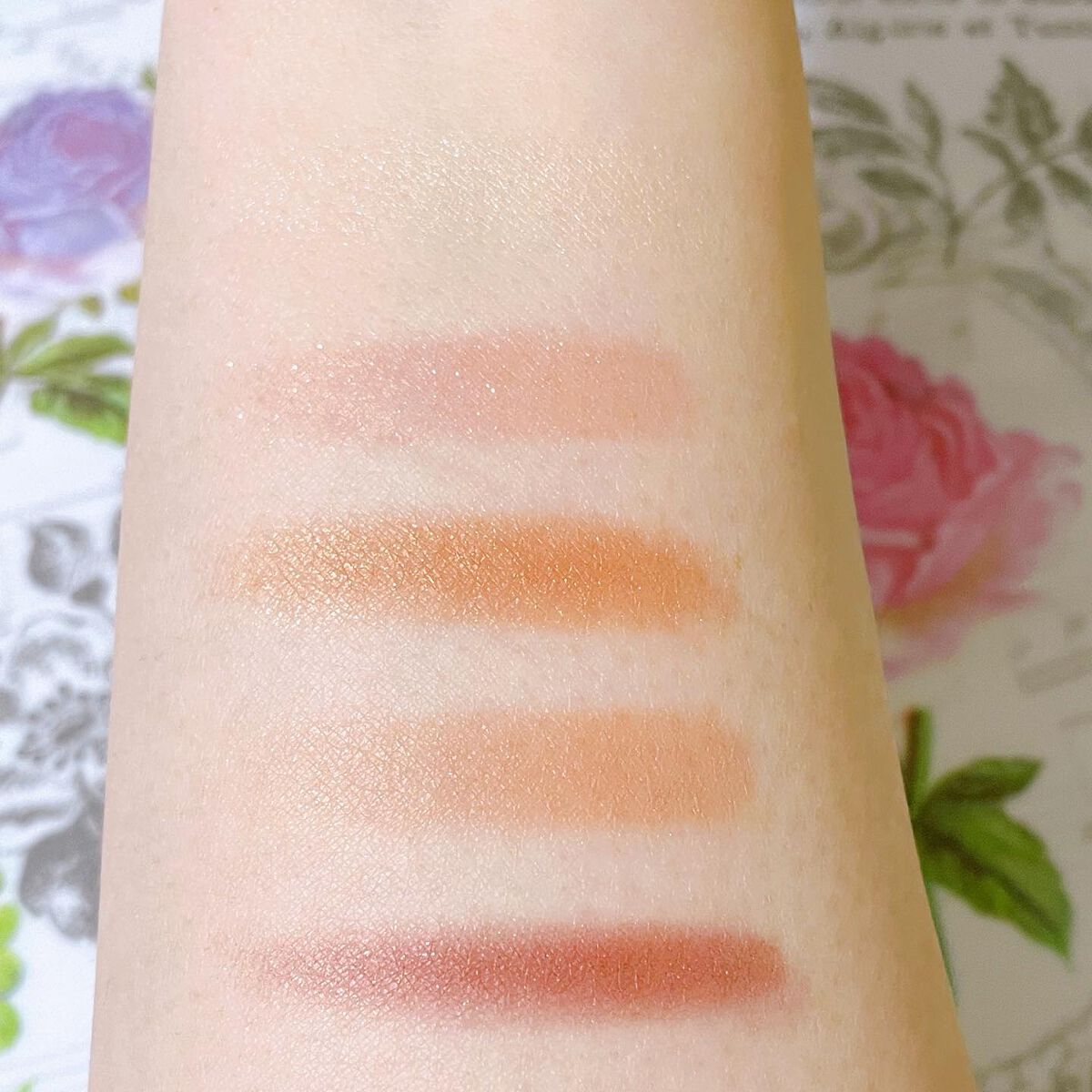 コーラルベース × ゴールドパール × ホワイトパールの3色の組み合わせです!! コーラル系がベースなので日本人の肌に とても馴染むと思います! こちらも薄付きなのでチークは勿論ハイライトとしても使用出来ます! 下瞼から目尻に掛けて塗ればマスク生活でも華やかな目元に仕上がります! コーラル系なので肌を白く見せてくれる色味だと思いました! 使用感も柔かく しっとりしているので保湿効果もあります! デイリーメイクに使いやすい色だと思いました。 目元とリップに重ねると顔全体が統一感が出るので可愛いく仕上げる事が出来ます♡ 写真よりも実際は色味が もっとしっかり出るのでその日の気分によって色の濃さを調整しやすいと思います!