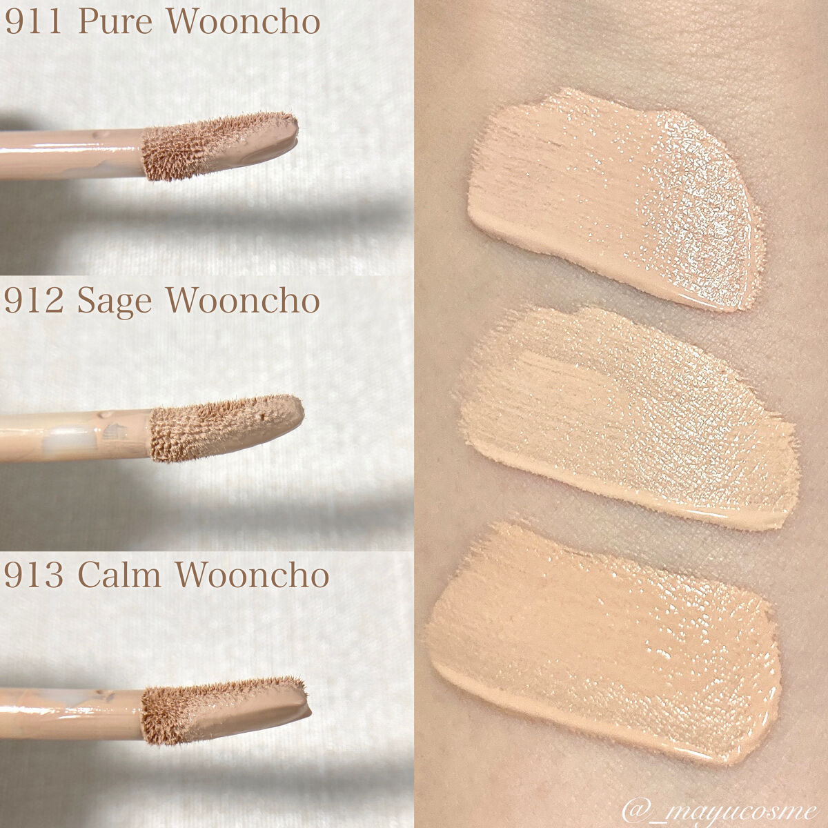 - <911 pure wooncho> 水、酸化チタン (CI 77891)、イソドデカン、ジメチコン、トリメチルシロキシケイ酸、グリセリン、ポリグリセリン-3(ポリジメチルシロキシエチルジメチコン/メチコン)コポリマー、DPG、水添C6-14オレフィンポリマー、メタクリル酸メチルクロスポリマー、ペンチレングリコール、シクロペンタシロキサン、カプリリルメチコン、シロキクラゲエキス、アシタバエキス、タイワンツナソ葉エキス、ヤマノイモ根エキス、オクラ果実エキス、ハス根エキス、ジステアルジモニウムヘクトライト、ジポリヒドロキシステアリン酸ポリグリセリル-2、セスキオレイン酸ソルビタン、(ベヘン酸/エイコサン二酸)グリセリル、硫酸Mg、ステアロイルグルタミン酸2Na、水酸化Al、(セテアリルジメチコン/ビニルジメチコン)クロスポリマー、ジメチコンクロスポリマー、カプリリルグリコール、カプリル酸グリセリル、(ビニルジメチコン/メチコンシルセスキオキサン)クロスポリマー、エチレンジアミンジコハク酸3Na、アラントイン、パンテノール、トコフェロール、BG、1,2-ヘキサンジオール、香料、安息香酸ベンジル、CI 77492 (CI 77492)、CI 77491 (CI 77491)、CI 77499 (CI 77499) <912 sage wooncho> 水、酸化チタン (CI 77891)、イソドデカン、ジメチコン、トリメチルシロキシケイ酸、グリセリン、ポリグリセリン-3(ポリジメチルシロキシエチルジメチコン/メチコン)コポリマー、DPG、水添C6-14オレフィンポリマー、ペンチレングリコール、メタクリル酸メチルクロスポリマー、シクロペンタシロキサン、カプリリルメチコン、CI 77492 (CI 77492)、シロキクラゲエキス、アシタバエキス、タイワンツナソ葉エキス、ヤマノイモ根エキス、オクラ果実エキス、ハス根エキス、ジステアルジモニウムヘクトライト、ジポリヒドロキシステアリン酸ポリグリセリル-2、セスキオレイン酸ソルビタン、(ベヘン酸/エイコサン二酸)グリセリル、硫酸Mg、ステアロイルグルタミン酸2Na、水酸化Al、(セテアリルジメチコン/ビニルジメチコン)クロスポリマー、ジメチコンクロスポリマー、カプリリルグリコール、カプリル酸グリセリル、(ビニルジメチコン/メチコンシルセスキオキサン)クロスポリマー、エチレンジアミンジコハク酸3Na、アラントイン、パンテノール、トコフェロール、BG、1,2-ヘキサンジオール、香料、安息香酸ベンジル、CI 77491 (CI 77491)、CI 77499 (CI 77499) <913 calm wooncho> 水、酸化チタン (CI 77891)、イソドデカン、ジメチコン、トリメチルシロキシケイ酸、グリセリン、ポリグリセリン-3(ポリジメチルシロキシエチルジメチコン/メチコン)コポリマー DPG、水添C6-14オレフィンポリマー、ペンチレングリコール、シクロペンタシロキサン、カプリリルメチコン、CI 77492 (CI 77492)、メタクリル酸メチルクロスポリマー、シロキクラゲエキス、アシタバエキス、タイワンツナソ葉エキス、ヤマノイモ根エキス、オクラ果実エキス、ハス根エキス、ジステアルジモニウムヘクトライト ジポリヒドロキシステアリン酸ポリグリセリル-2、セスキオレイン酸ソルビタン、(ベヘン酸/エイコサン二酸)グリセリル、硫酸Mg、ステアロイルグルタミン酸2Na、水酸化Al、(セテアリルジメチコン/ビニルジメチコン)クロスポリマー、ジメチコンクロスポリマー、カプリリルグリコール、カプリル酸グリセリル (ビニルジメチコン/メチコンシルセスキオキサン)クロスポリマー、エチレンジアミンジコハク酸3Na、アラントイン、パンテノール、トコフェロール、BG、1,2-ヘキサンジオール、香料、安息香酸ベンジル、CI 77491 (CI 77491)、CI 77499 (CI 77499)