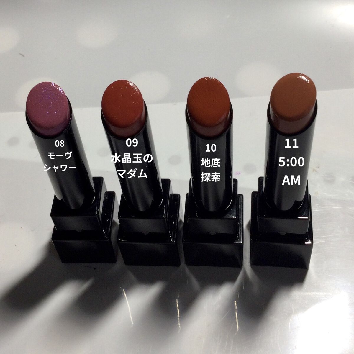 色持ちも発色も塗りやすさも大好きで全色集めた! カラーバリエーションが増えていくのが毎回楽しみ! 心の奥でいろづく欲望のようなピンクレッド ☆肌白く見える。白雪姫っぽさを感じる 煮詰めたカボチャとワインの深みを感じるテラコッタブラウン ☆秋って感じの色味。おいしそう
