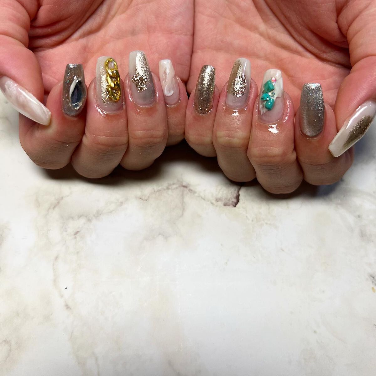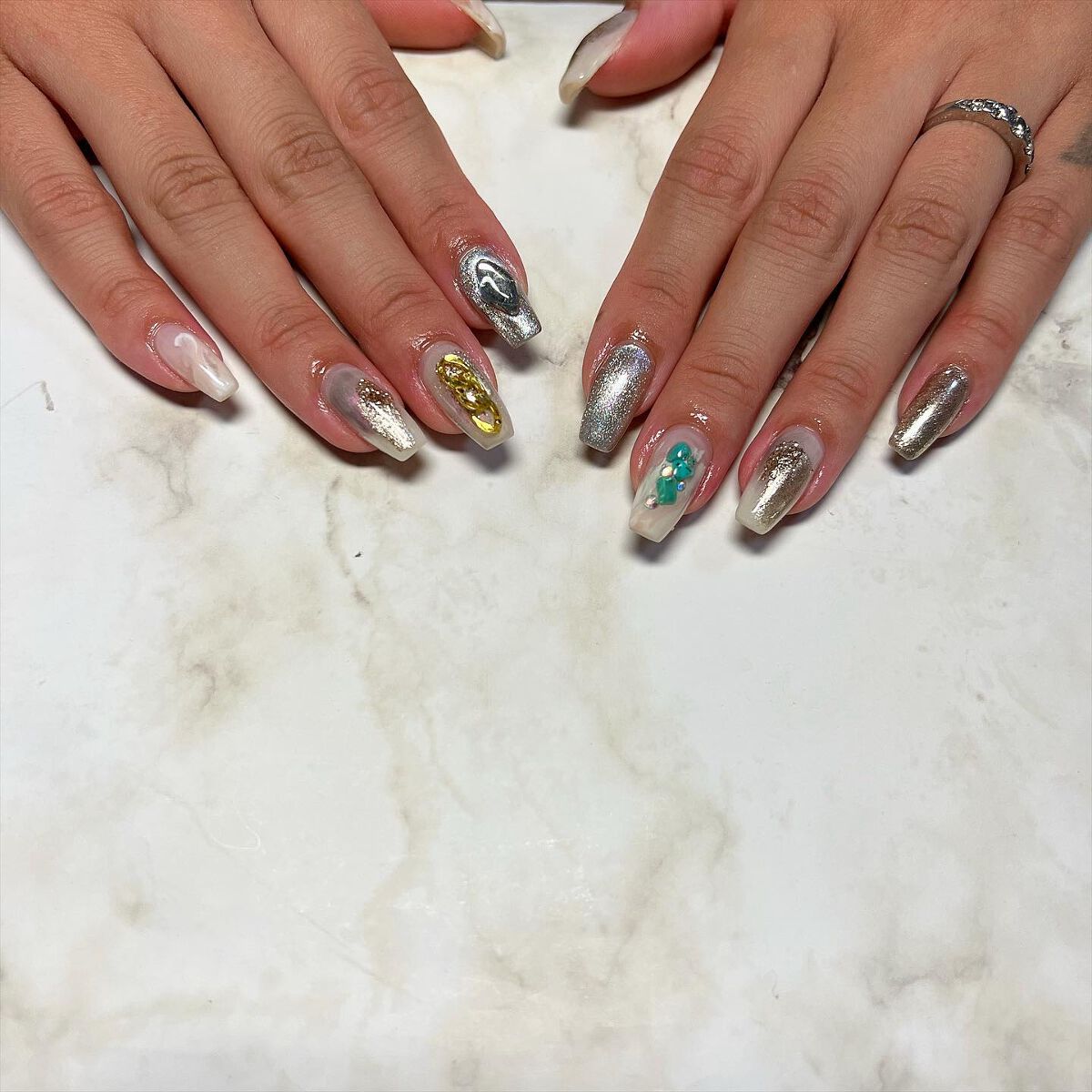こちらおまかせでさせていただいたネイルです💅💅💅💅看板メニューのおまかせコースです❤️❤️❤️✼••┈┈••✼••┈┈••✼••┈┈••✼••┈┈••✼#glitter#silvernails#glitternails#unicorn#ネイル...
