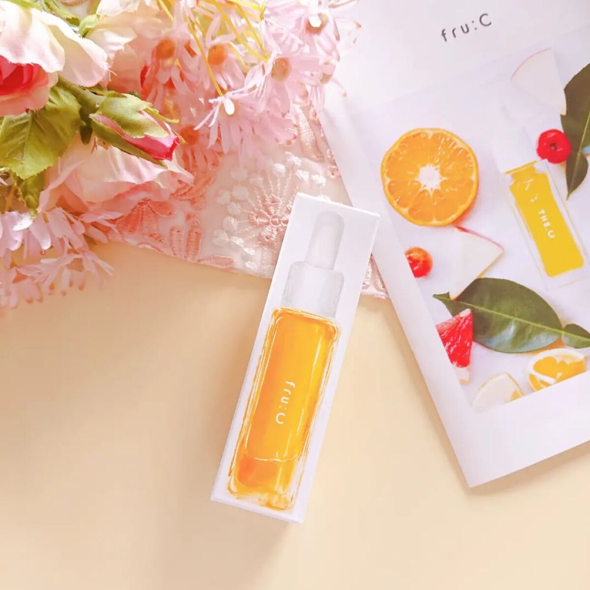 Fru:CオールインワンビタミンC美容液これは自然由来のフルーツエキスとフレッシュビタミンCを凝縮した、まるで果汁のような美容液。シミ、毛穴、くすみ、ニキビ跡、ニキビなど肌荒れにお悩みの方にオススメ。空気に触れると酸化しやすく、肌に届くまでに...