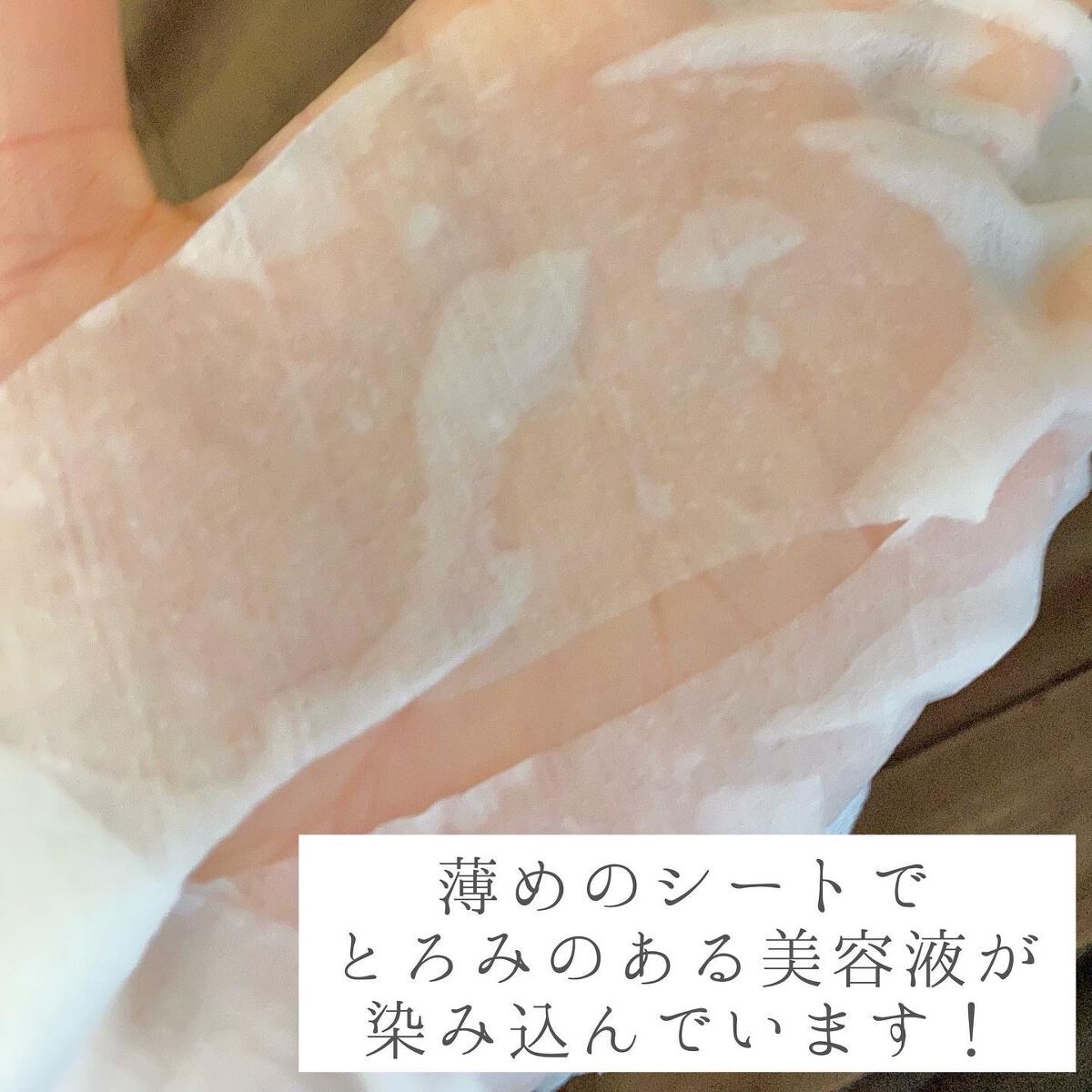 何種類かありますが、1番人気な金色のパケにしました。こちらは毛穴やざらつき、年齢とともに気になるくすみにアプローチ。肌に潤いを与え、ハリとクリアな肌に導くタイプのものです! 開けてびっくり!美容液の量ハンパないです。少しとろみのある美容液がたっぷり🫣✨ シートの材質はコットン系の不織布みたいです。このようなシートは普段貼りにくいのですが、美容液がひたひたなのでお肌にしっかり張り付いてくれます。シートのサイズも私は結構良い印象でした! 貼った後のお肌の潤い具合はんぱないです!しっかり付いた美容液を馴染ませて、剥がしたシートに付いた美容液は全身に塗って(それでもまだひたひたのままでした!)いつものスキンケアをして美容成分を閉じ込めます☺️ 夜のスキンケアはビシャビシャになるまで保湿したい派の私としては最高のシートマスク!1枚100円なので個人的には少しリッチなシートマスクかなと思いますが、お出かけする前夜とか、大切な日の前夜に使いたいですね☺️🤍
