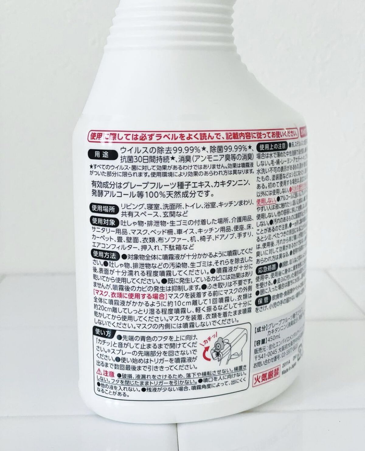 <有効成分天然物由来100%の抗ウイルス・抗菌スプレー> こちらは一本でいろいろな場所に使えるのがすごく便利です。 天然由来100%になっていますので、玄関やトイレ、キッチンまわりにも沢山使うことができます。 私のお家ではリビングに置いていて気づいた時に家中にたくさん使っております🐒✨ 小さな子供もいるので、抗菌作用が30日間持続するのもありがたいですし🕊なによりも容量も450mlとたっぷりなので長く使えるのでリピートしたいです🧡 ・使用後、30日間抗菌効果が持続します。※使用環境により効果のあらわれ方は異なります。 ・アンモニア臭等の消臭効果があります。 ・皮膚刺激性試験、吸入毒性試験、経口毒性試験を実施して安全性を確認しています。