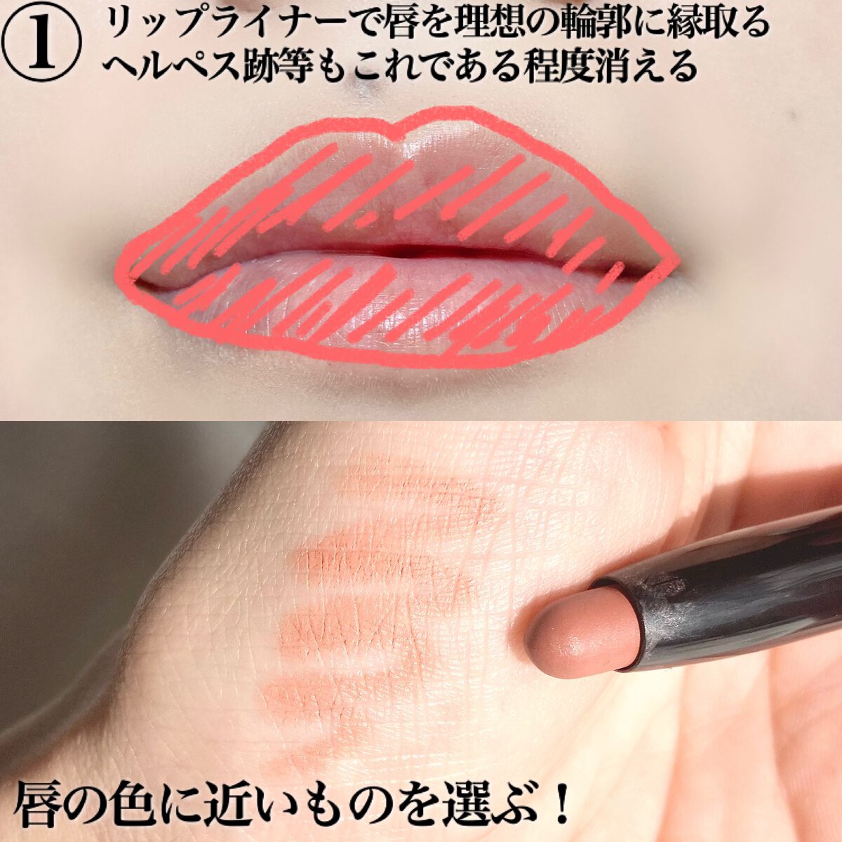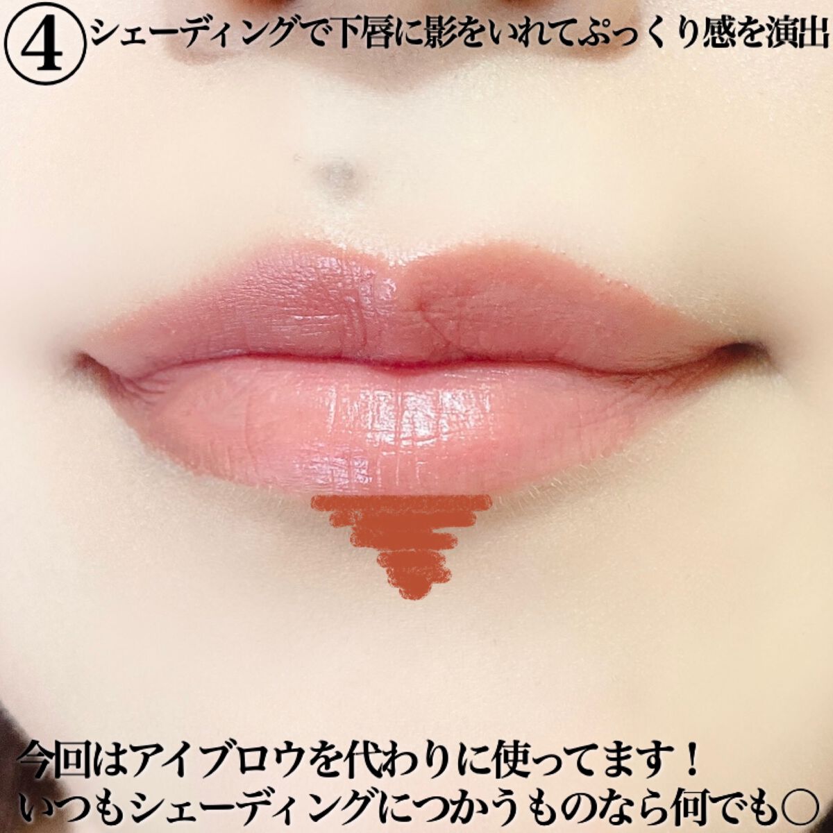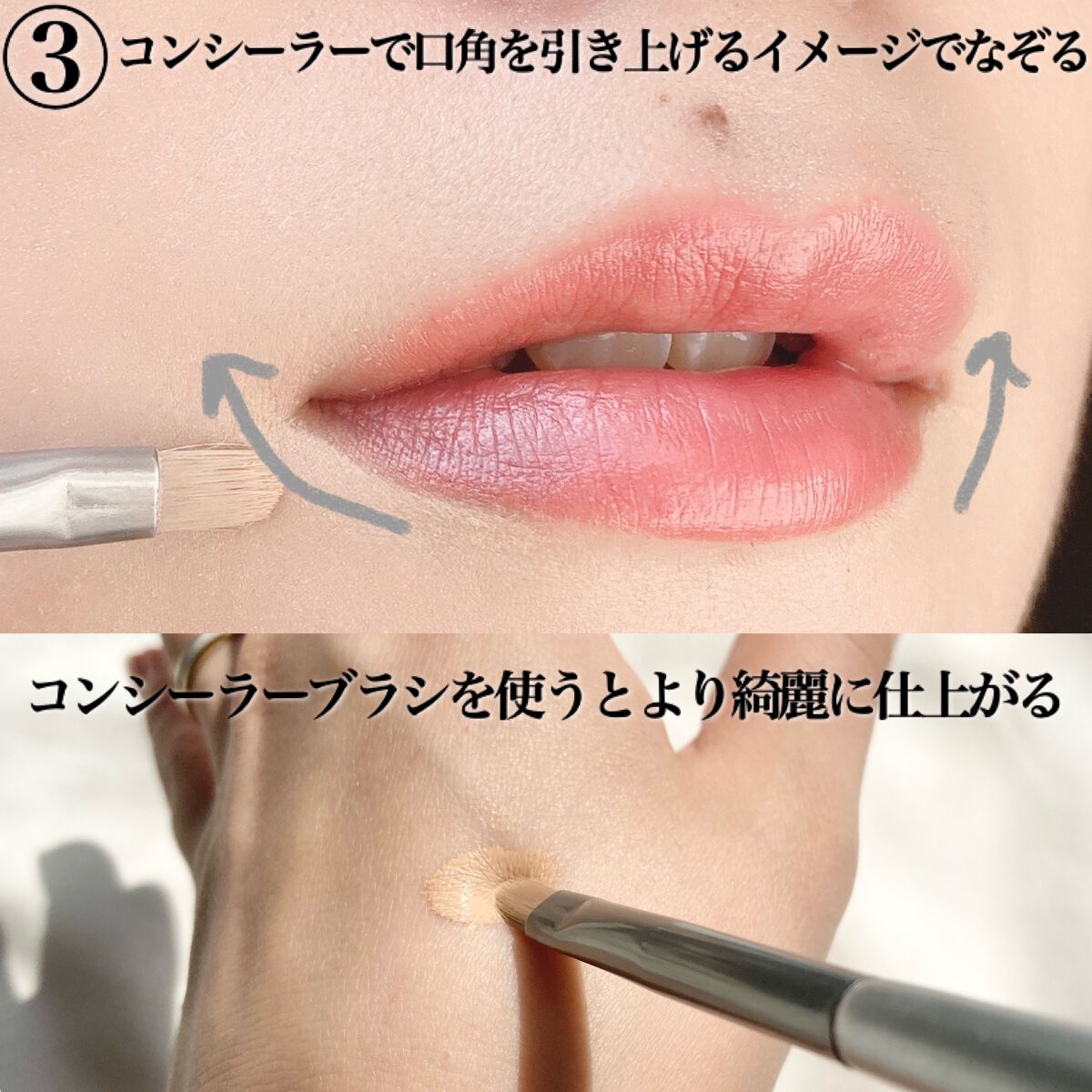 老化によるたるみのせいか(まだ老化だと思いたくない)、最近ぱっと鏡を見た時の真顔が怖い!そして老けてる!🤣 なんか口角が下がってるように見えたのでどうにかしようと思ったのがきっかけです! リップで上唇の終わりを少しあげる様に描く! アイブロウパウダーで作った口角を囲うように線を描く! ハイライター等で下唇のラインをグイッと上げるように描く!