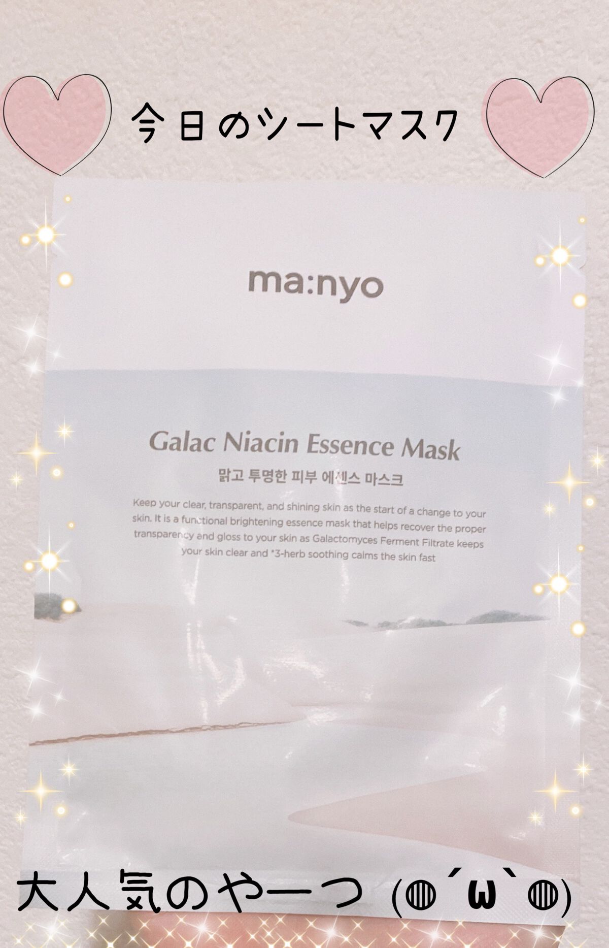 manyoガラクナイアシンエッセンスマスク美容液がたっぷりヒタヒタに染み込まれていてプルプルな感じの触り心地のマスク😊肌にもしっかりと密着してくれます👍! 100%竹から作られたシートみたいです🙄ヒアルロン酸の保湿でしっとりもち肌に✨液がたっ...