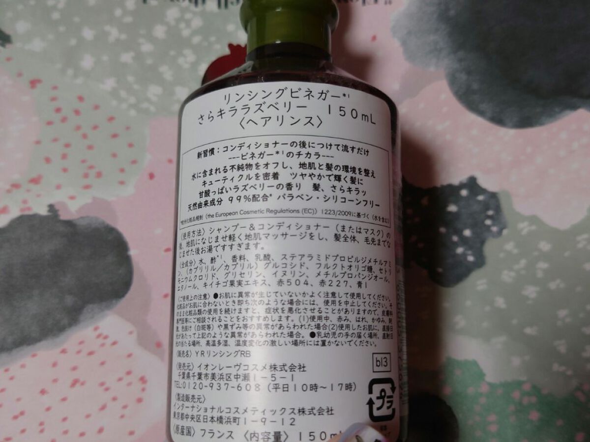 イヴ・ロシェリンシングビネガー・ピュアリフレッシュ うるつやモリンガ・シルキーシャイン さらキララズベリーこちらウエルシアでたまたま見つけて購入しました。コンディショナーやヘアマスクなどの後に頭皮や毛先に馴染ませて流すだけ!ビネガーのヘアトリ...